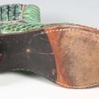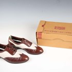 A pair of Judy Rothchild R Soles pink and green stained ankle boots, together with a pair of Yves Saint Laurent brown and white leather shoes.
