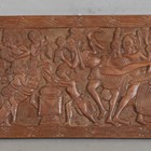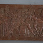 A mid-20th century African Benin carved wood plaque, height 38cm, width 150cm.