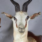 An early 20th century taxidermy specimen of a stag's head, width at antlers 76cm, together with a taxidermized springbok and a cased stoat, width 38cm.