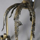 A pair of 20th century gilt brass three-branch wall lights with acanthus leaf mounts and glass storm lantern style shades, width 68cm.