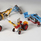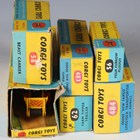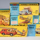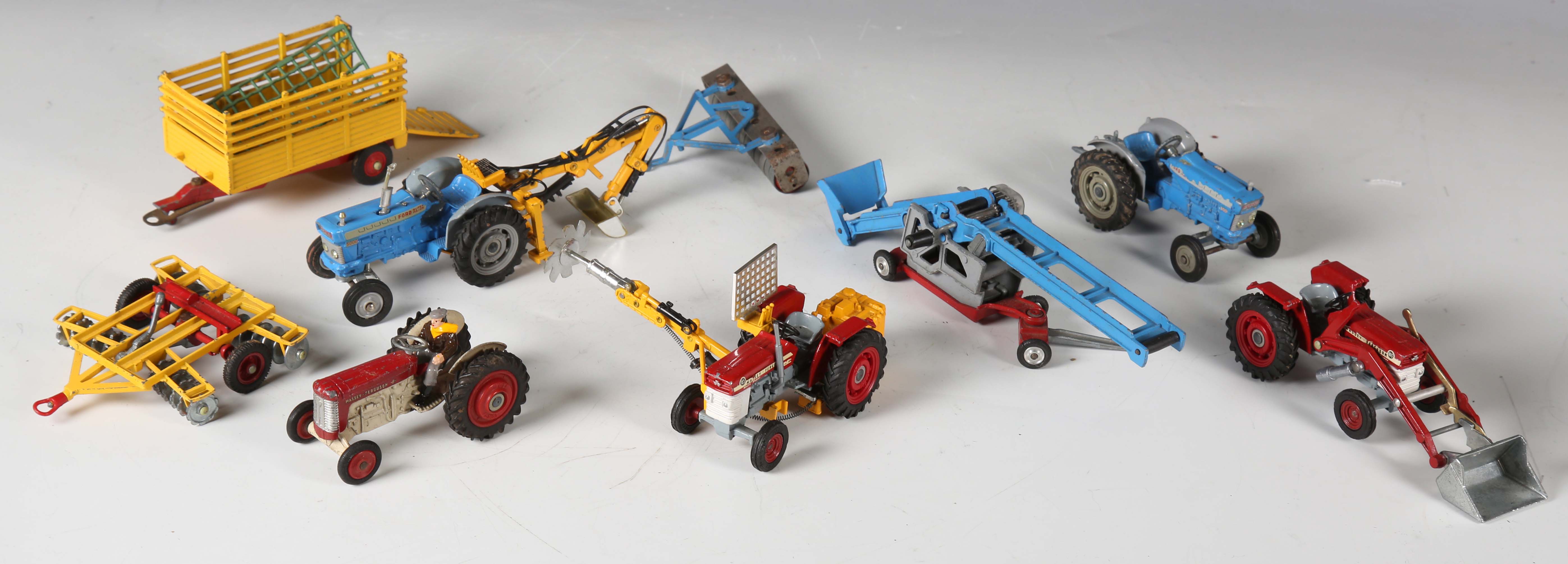 Six Corgi Toys farm vehicles and implements, comprising No. 64 conveyor on Jeep, No. 484 Dodge Kew Fargo livestock transporter and animals, No. 483 Dodge Kew Fargo tipper, No. 58 beast carrier, No. 56 four furrow plough and No. 62 farm tipper wagon, all boxed (boxes lightly creased and scuffed, Jeep box also lacking end flaps and three tabs), together with a group of Corgi Toys tractors, implements and figures.