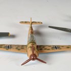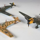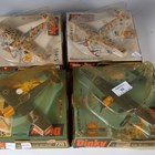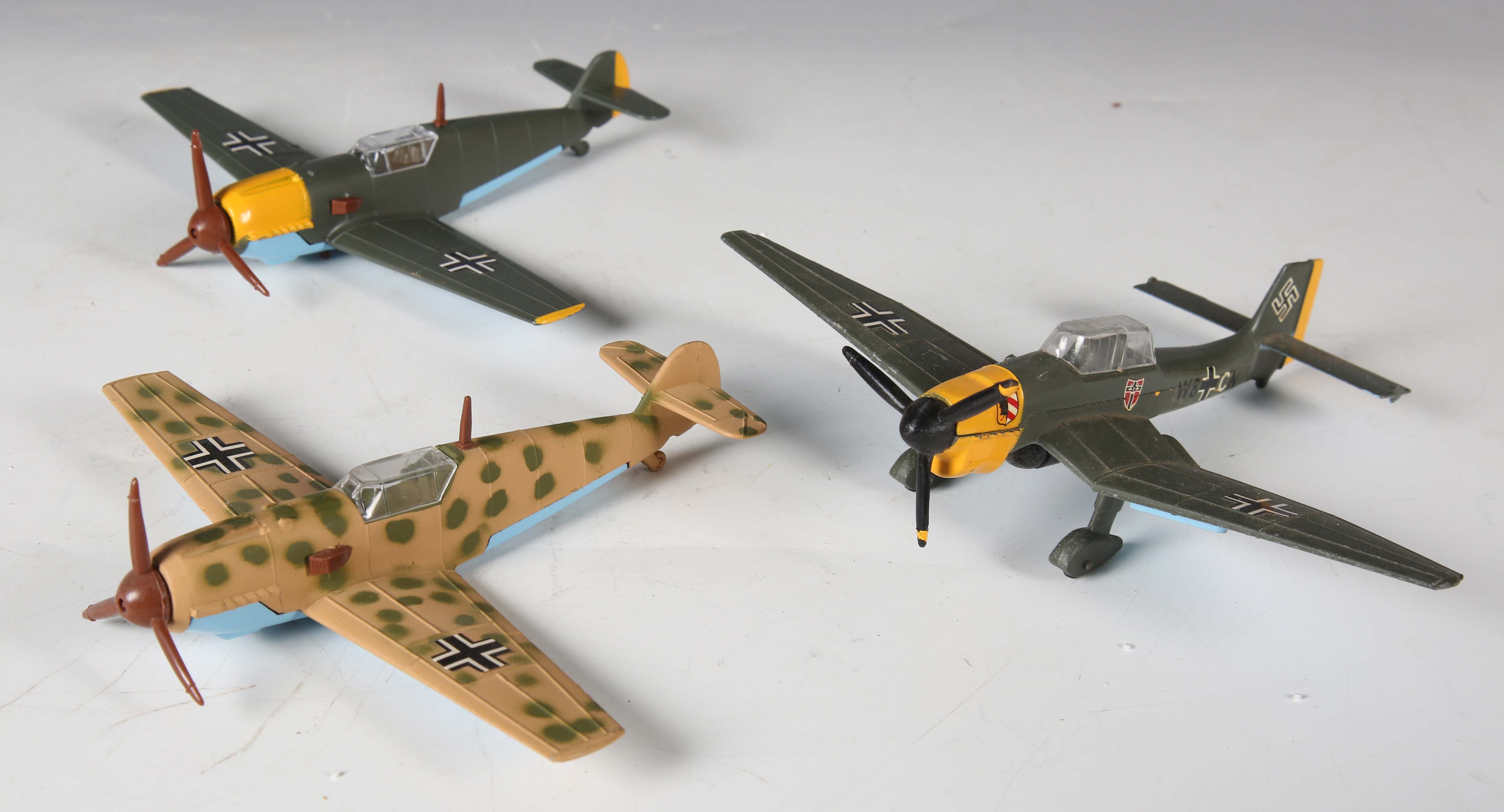 Four Dinky Toys German military aircraft, comprising three No. 726 Messerschmitt Bf 109E, two in desert camouflage, the other in green, and a No. 721 Junkers Ju 87B Stuka, all within bubble packs with card stands (paint chips to Stuka, bubble pack damage and sellotape repairs to card bases).