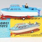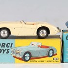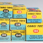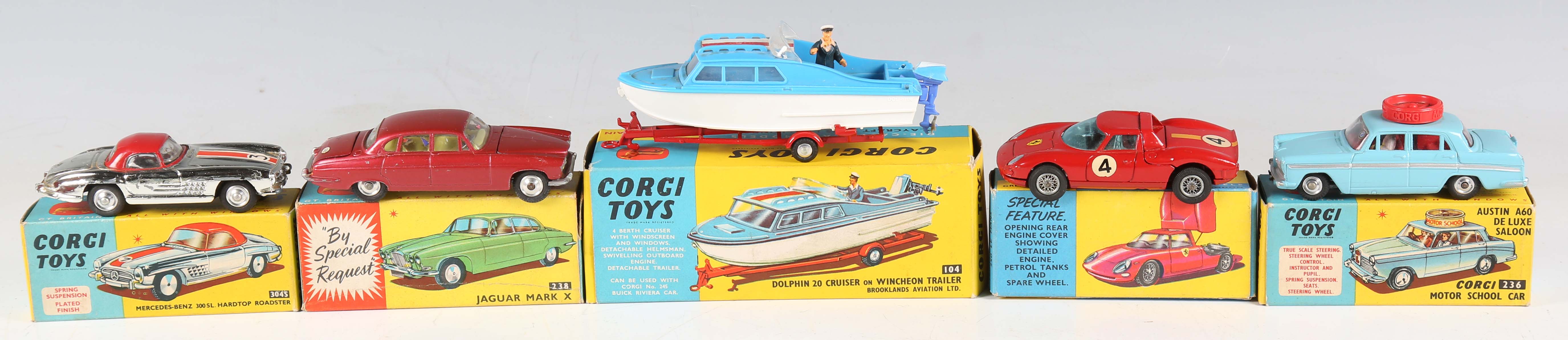 Seven Corgi Toys cars, comprising No. 226 Morris Mini Minor, No. 236 Austin A60 De Luxe saloon Corgi motor school car (lacking L plates), No. 238 Jaguar Mark X, No. 300 Austin Healey sports car (lacking windscreen), No. 304S Mercedes-Benz 300SL hardtop roadster, No. 314 Ferrari Berlinetta 250 Le Mans and No. 318 Lotus Elan S.2, together with a No. 104 Dolphin 20 Cruiser on Wincheon trailer, all boxed (paint chips, boxes lightly creased, torn and scuffed).