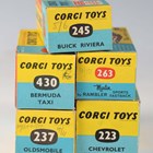 Five Corgi Toys American cars, comprising No. 223 Chevrolet ‘State Patrol’, No. 245 Buick Riviera, No. 263 Marlin by Rambler sports fastback, No. 237 Oldsmobile ‘Sheriff’ car and No. 430 Bermuda taxi, all boxed (some paint chips, boxes lightly creased and scuffed, No. 237 box has a hole).