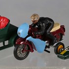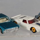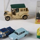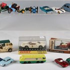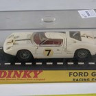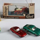 A group of diecast vehicles, including Dinky Toys No. 181 Volkswagen, No. 215 Ford GT racing car, within a plastic display case, three Britains motorcycles and Matchbox vehicles (playwear and faults).