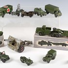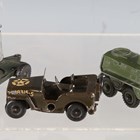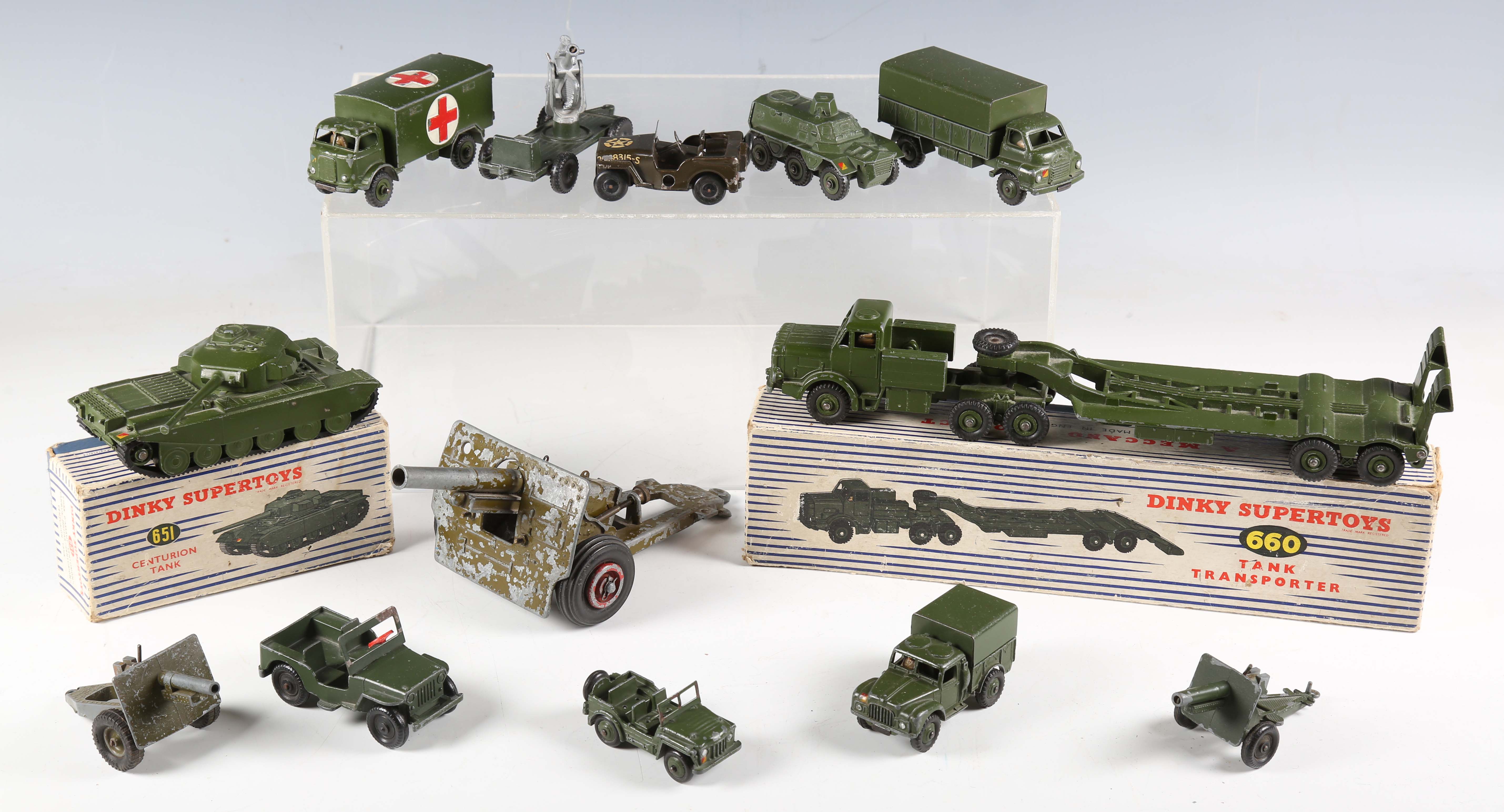 A group of Dinky Toys and Supertoys army vehicles, including No. 660 tank transporter, boxed, No. 651 Centurion tank, boxed, No. 626 military ambulance and No. 621 3-ton army wagon, together with a Minic Toys Jeep and a Lone Star Jeep (playwear, boxes creased and scuffed).
