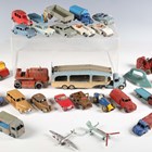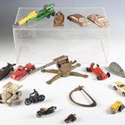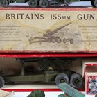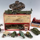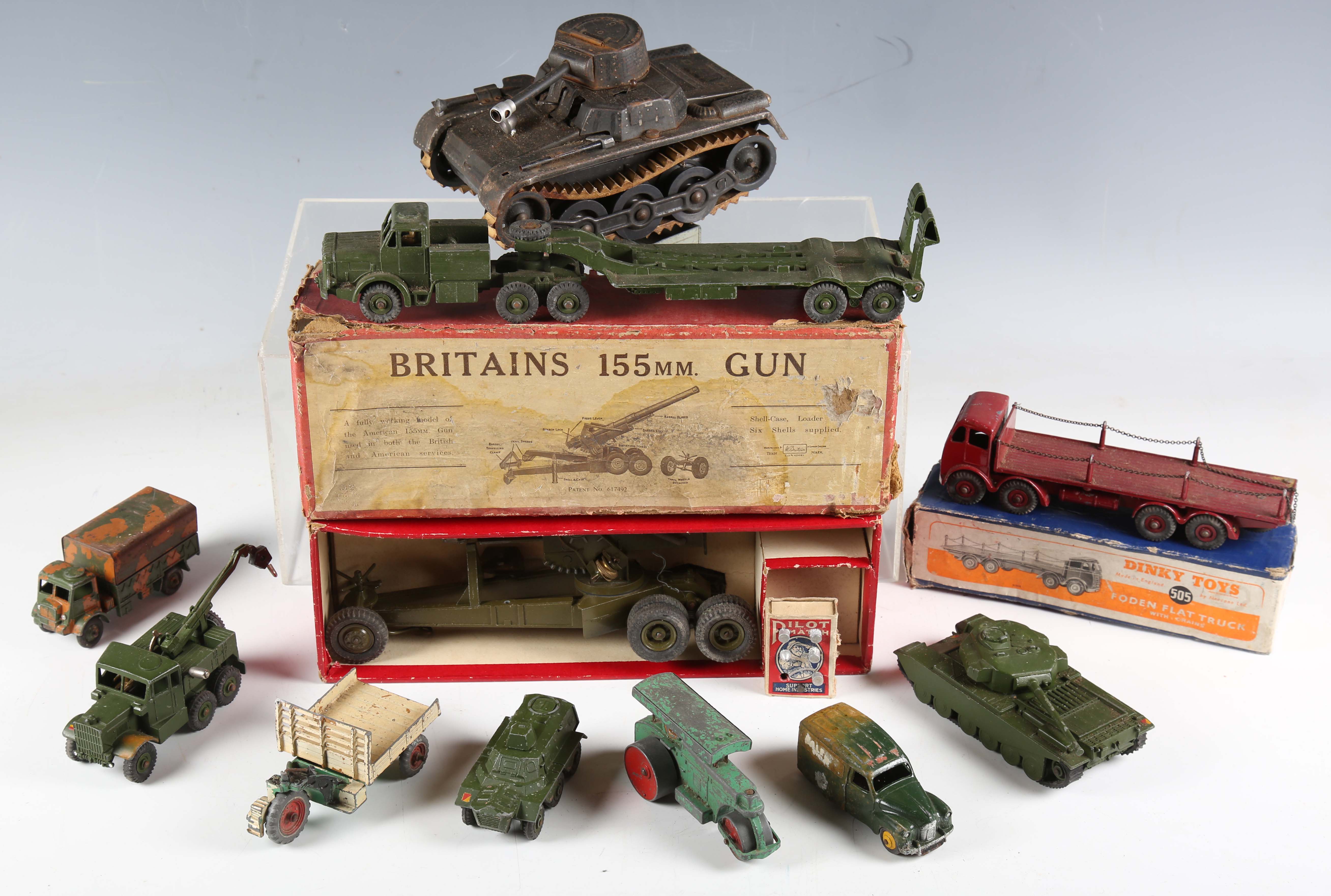 A collection of Dinky Toys and Supertoys cars, commercial and army vehicles (playwear and repainting), together with a Britains 155mm gun, a Gama tinplate tank and a Schuco clockwork mouse.