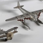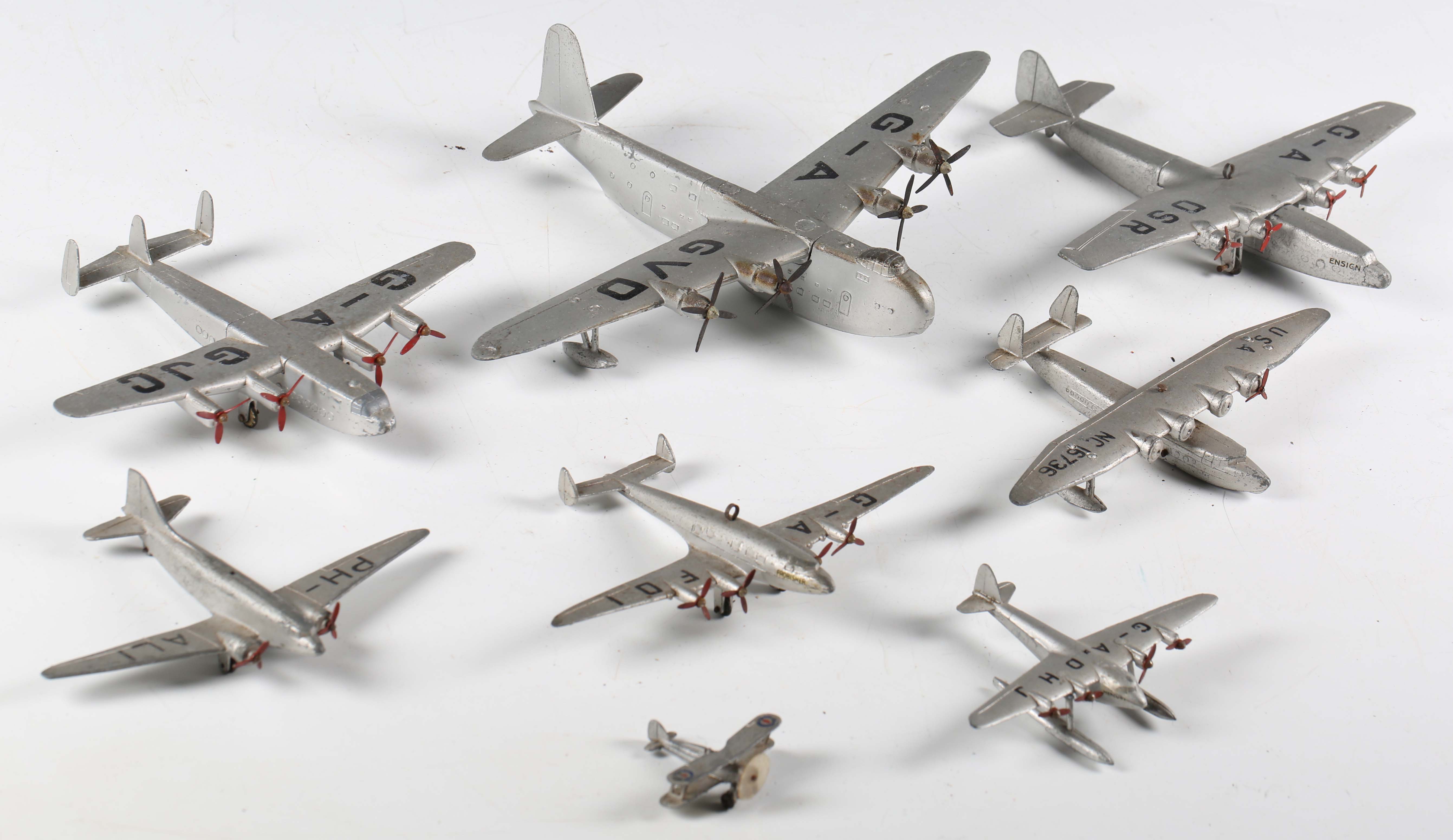 Eight Dinky Toys aircraft, comprising No. 701 Shetland Flying Boat, No. 70A Avro York, No. 60T Douglas DC3, No. 62p Ensign Class Airliner, No. 62w Frobisher Class Airliner, No. 60w Clipper III, No. 63b Mercury Seaplane and No. 60p Gloster Gladiator (paint chips, playwear, fatigue and loose parts).