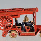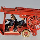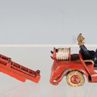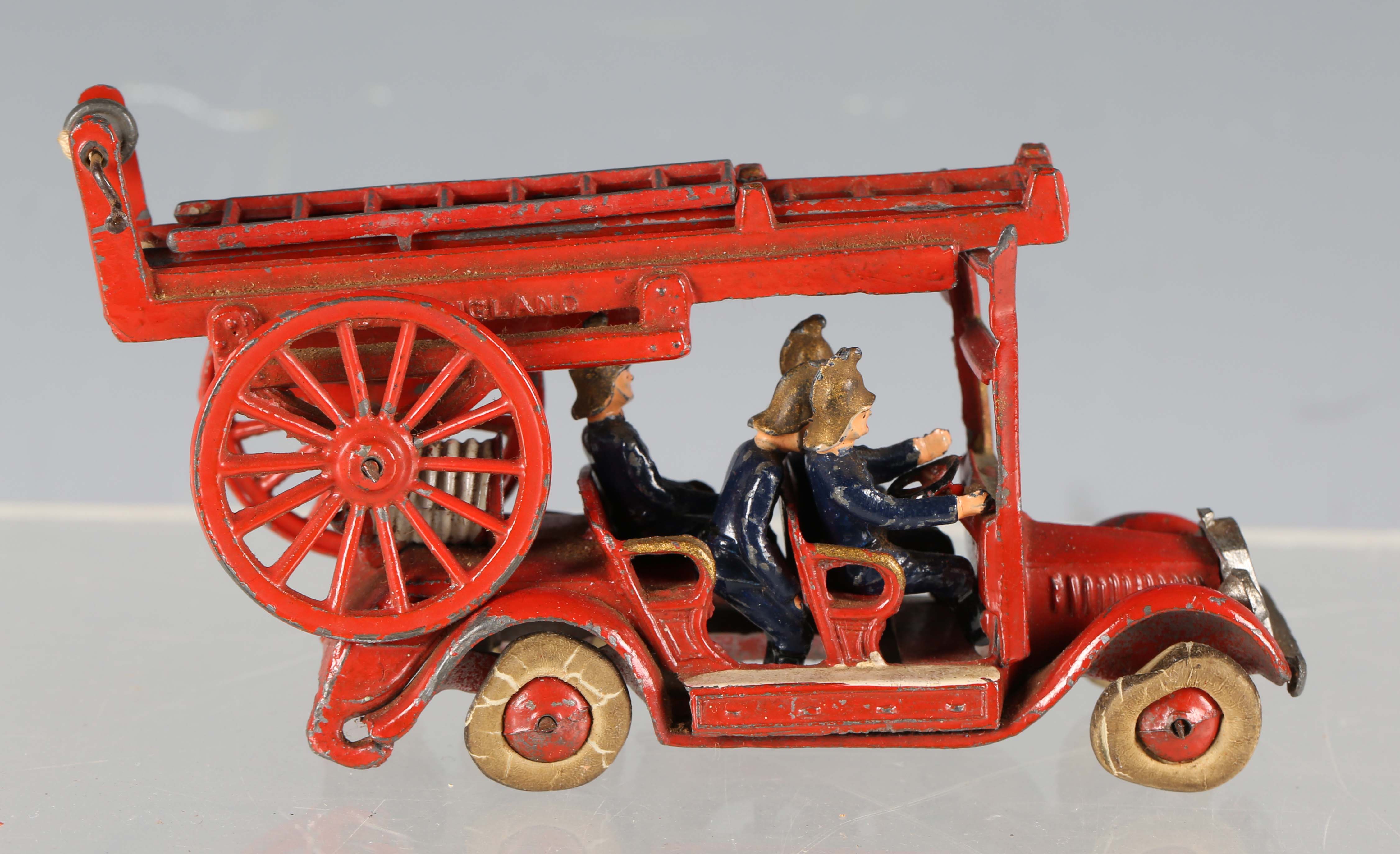 A Taylor & Barrett No. 16 fire engine and escape in red with white tyres and four figures (paint chips, tyres cracked).