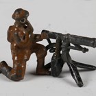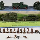 A pre-war Dinky Toys No. 152 Royal Tank Corps light tank unit set, comprising No. 152A light tank and No. 152B reconnaissance car (lacking No. 152C Austin Seven car), boxed, together with two Britains field guns, two anti-aircraft guns, a Skybirds six wheel tanker ‘Esso’ in dark green, and a small group of Skybirds military figures (paint chips and playwear, box scuffed and stained).