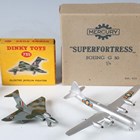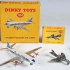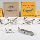 Three Dinky Toys aircraft, comprising No. 706 Vickers Viscount Air Liner, No. 735 Gloster Javelin Fighter and No. 736 Hawker Hunter Fighter, all boxed, together with a No. 23s Thunderbolt, a No. 30F ambulance, a Corgi Toys Rolls-Royce, two Tootsietoy American naval ships, a Mercury Superfortress, boxed, and a Mercury Lockheed F-90.