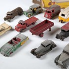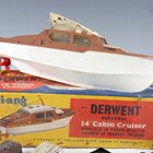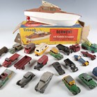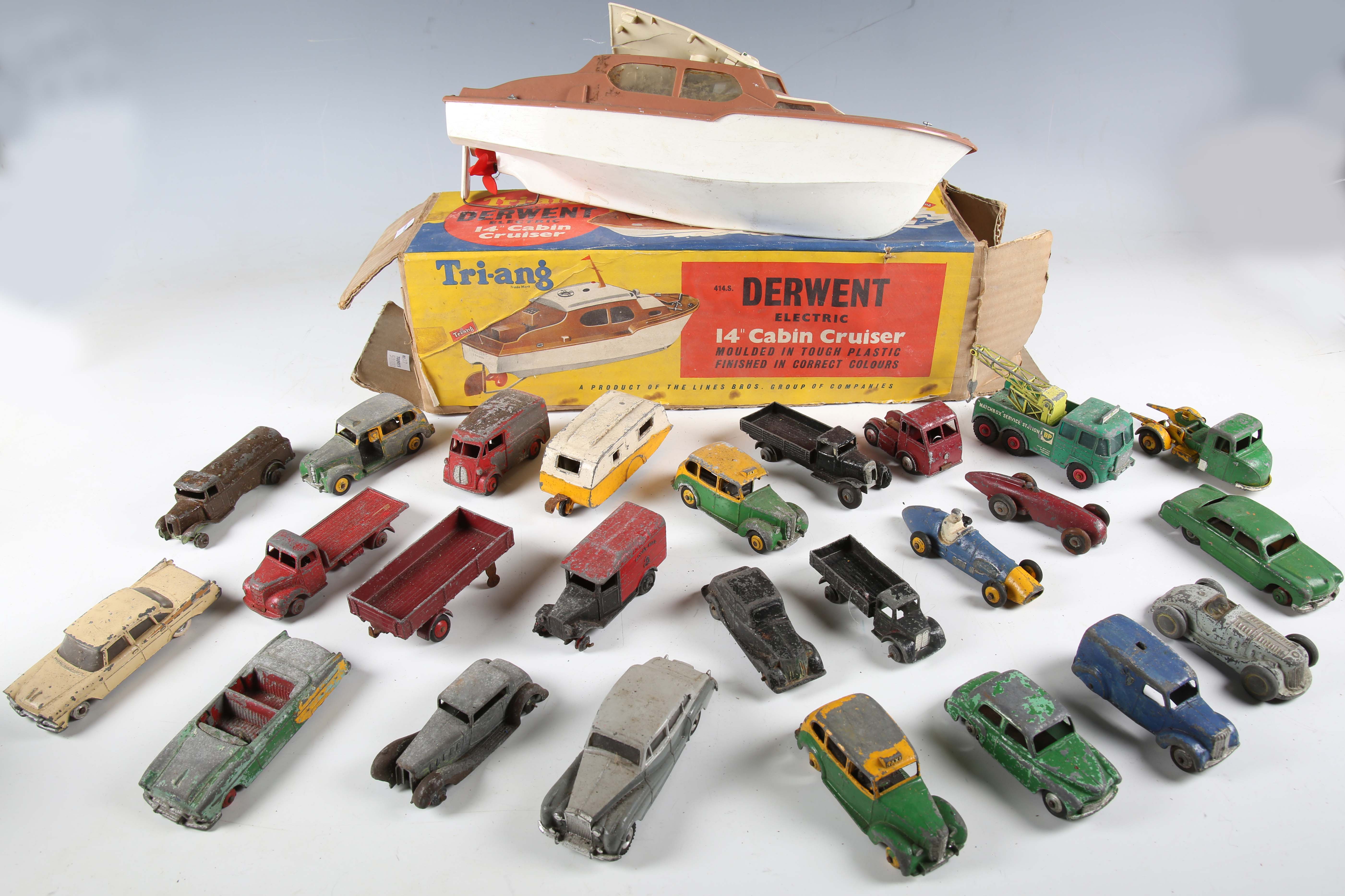 A group of Dinky Toys vehicles, including No. 150 Rolls-Royce Silver Wraith, No. 234 Ferrari and No. 190 caravan, together with four other diecast vehicles and a Tri-ang cabin cruiser (playwear).
