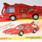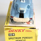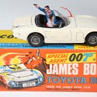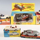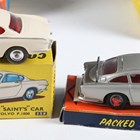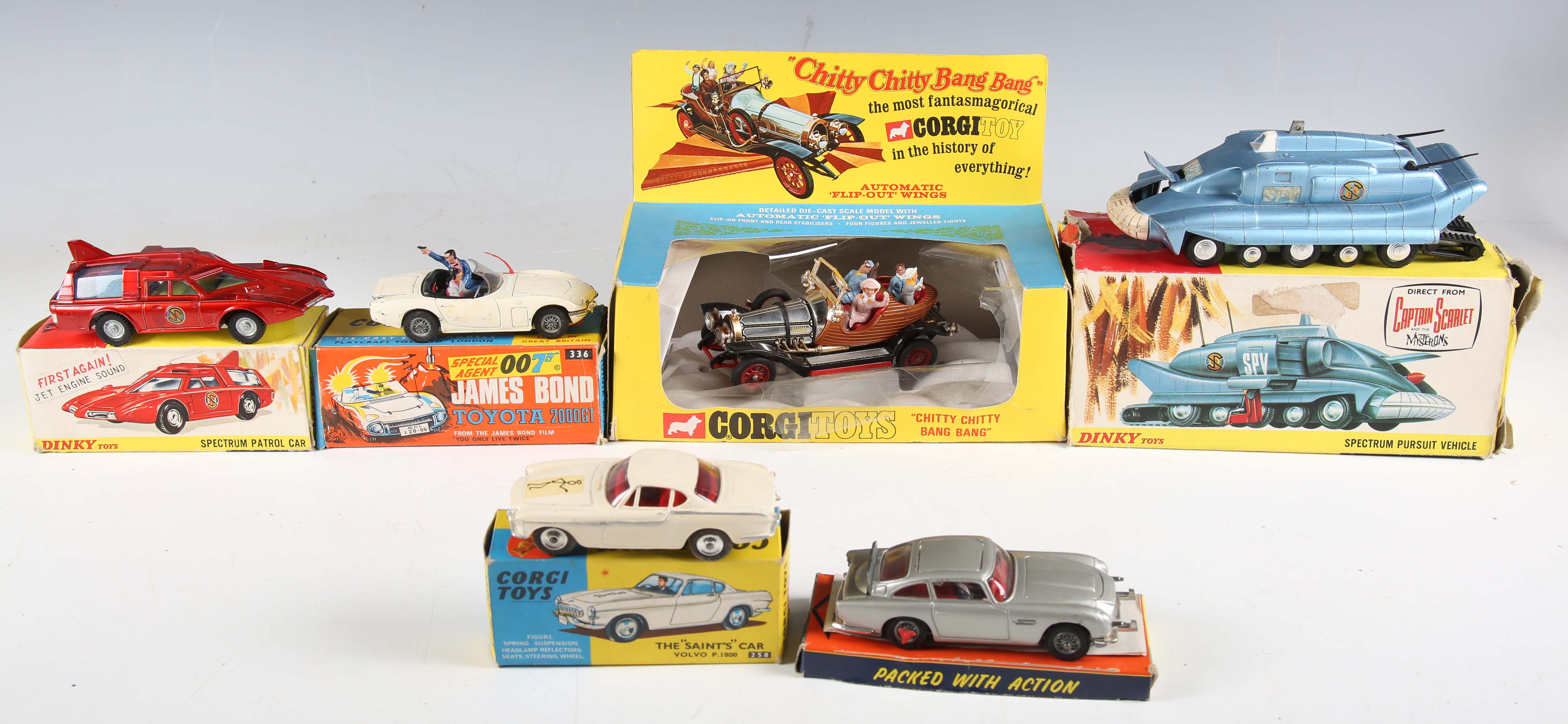 Four Corgi Toys television and film vehicles, comprising No. 270 James Bond Aston Martin with card stand, two bandit figures and instructions, No. 336 James Bond Toyota 2000GT, boxed with diorama, No. 258 The Saint's Car Volvo P.1800 and No. 266 Chitty Chitty Bang Bang, together with a Dinky Toys No. 103 Spectrum Patrol Car and a No. 104 Spectrum Pursuit Vehicle, all boxed (playwear and paint chips, boxes damaged).