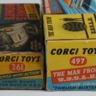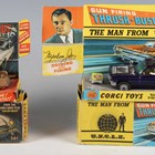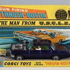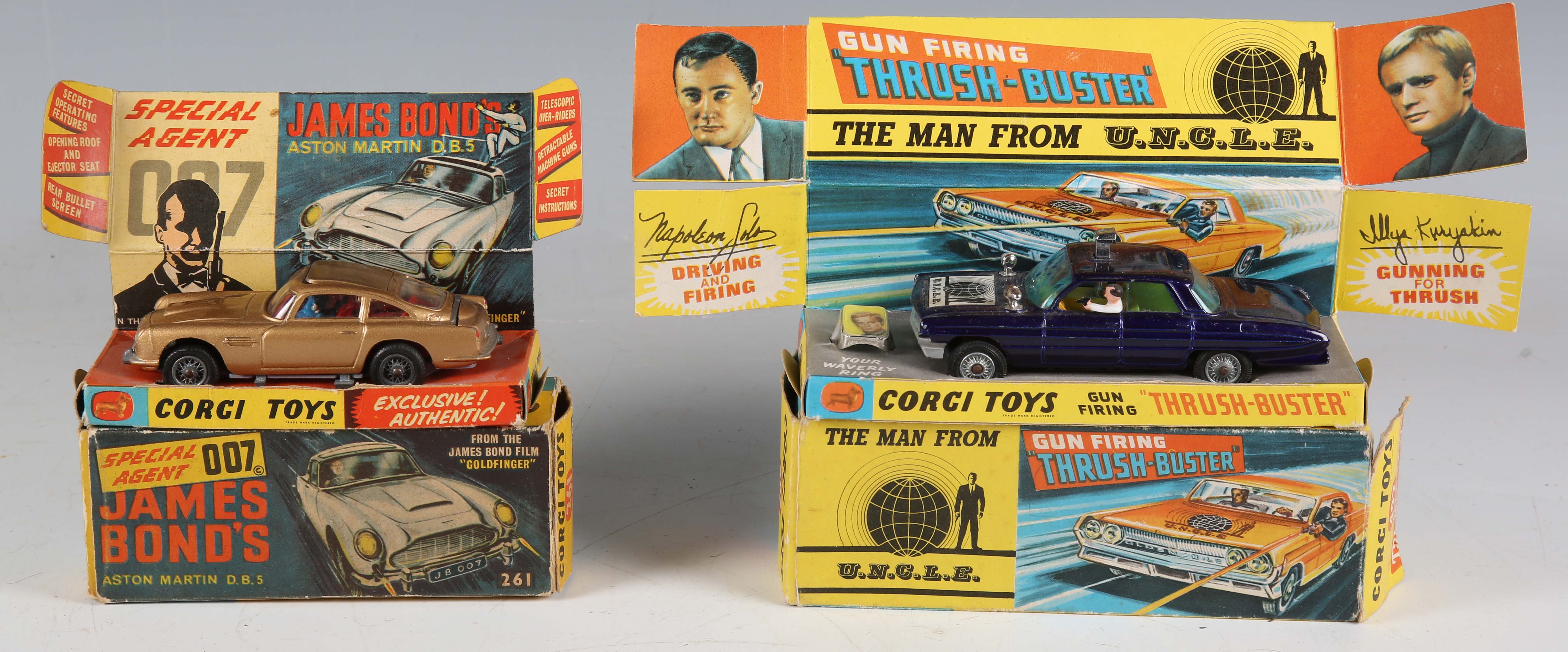 A Corgi Toys No. 497 The Man from UNCLE Thrush Buster, boxed with diorama and Waverley ring, together with a No. 261 James Bond’s Aston Martin, boxed with diorama (minor paint chips, boxes creased, scuffed, torn and repaired).