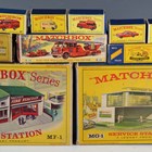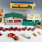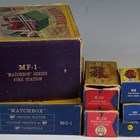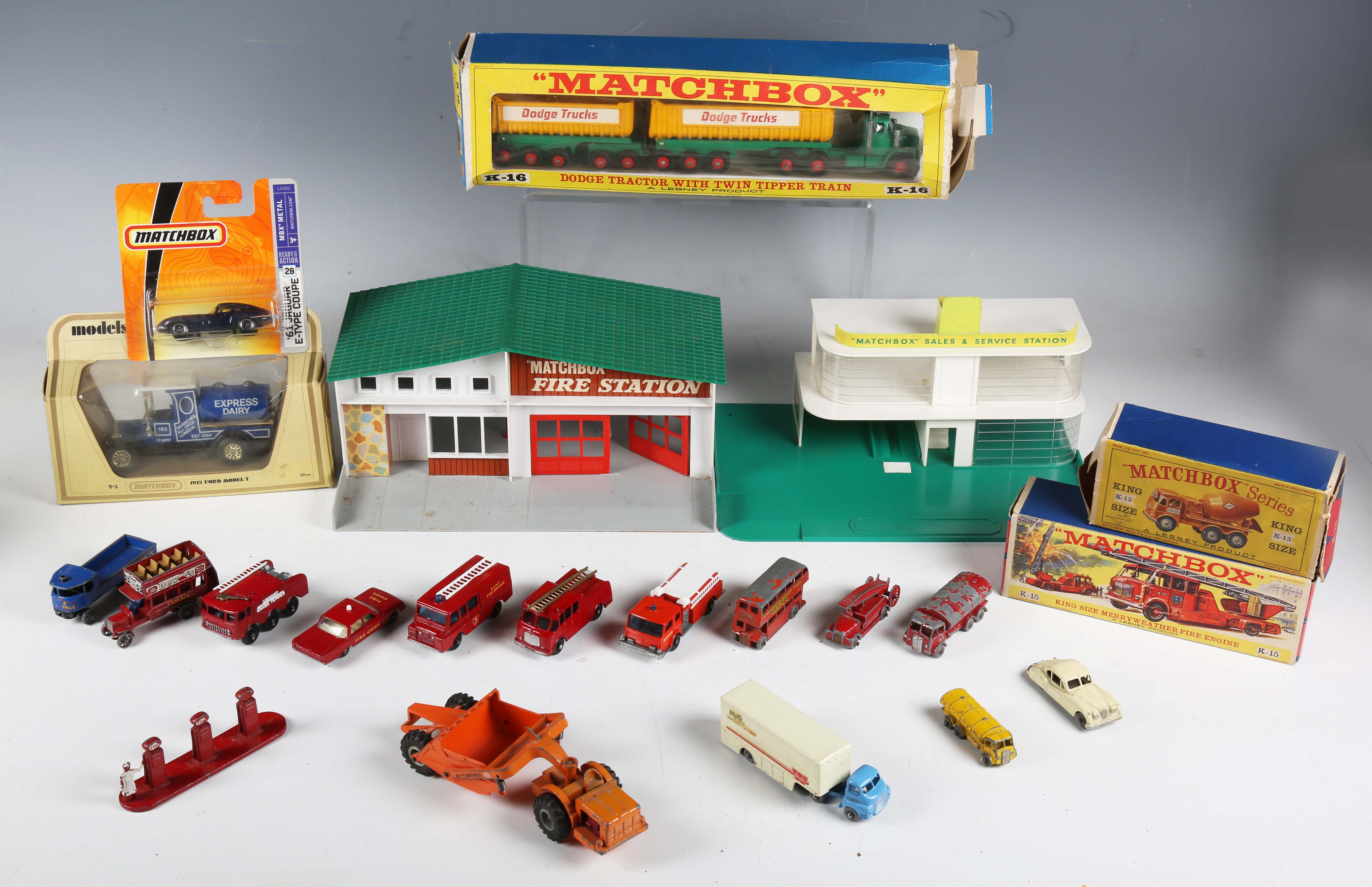 A group of Matchbox vehicles and accessories, comprising No. 9 Fire Escape, No. 29c Fire Pumper truck, No. 57c Land Rover Fire Truck, No. 63B Alvis Foamite crash tender, No. 59B Ford Fairlane Fire Chief car, No. 62 TV service van, K-15 Merryweather fire engine, K-13 Ready Mix concrete truck, Major Pack No. 2 Bedford articulated ice cream lorry 'Wall's', King Size K-16 Dodge tractor with twin tipper train, MF-1 Fire Station and MG-1 Service Station, all boxed, and ten other Matchbox vehicles (some paint chips, boxes damaged).
