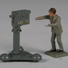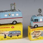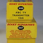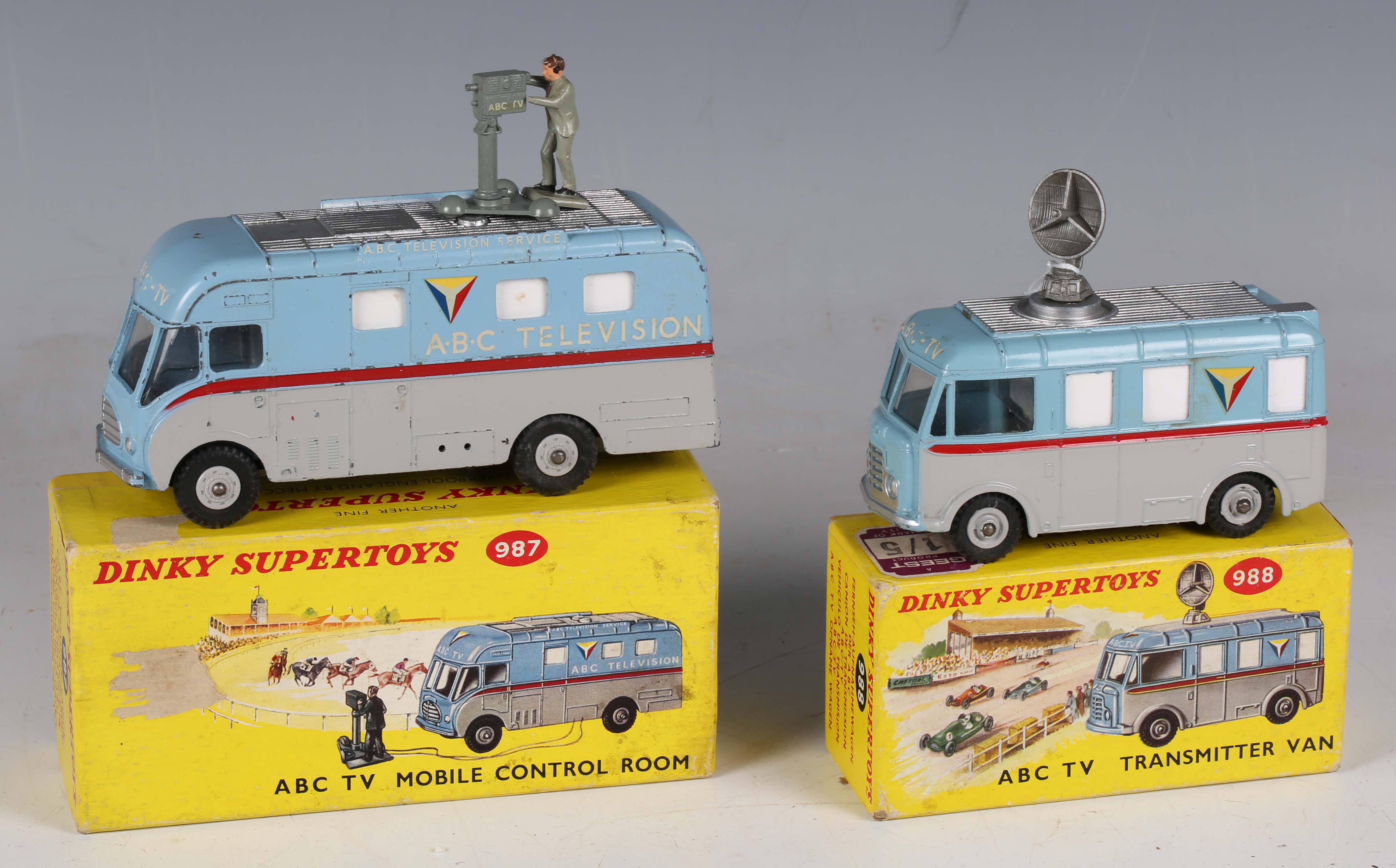 A Dinky Supertoys No. 987 ABC TV mobile control room with camera and cameraman, boxed, and a No. 988 ABC TV transmitter van with plastic aerial, boxed (some paint chips, boxes scuffed, stained and torn).