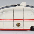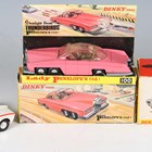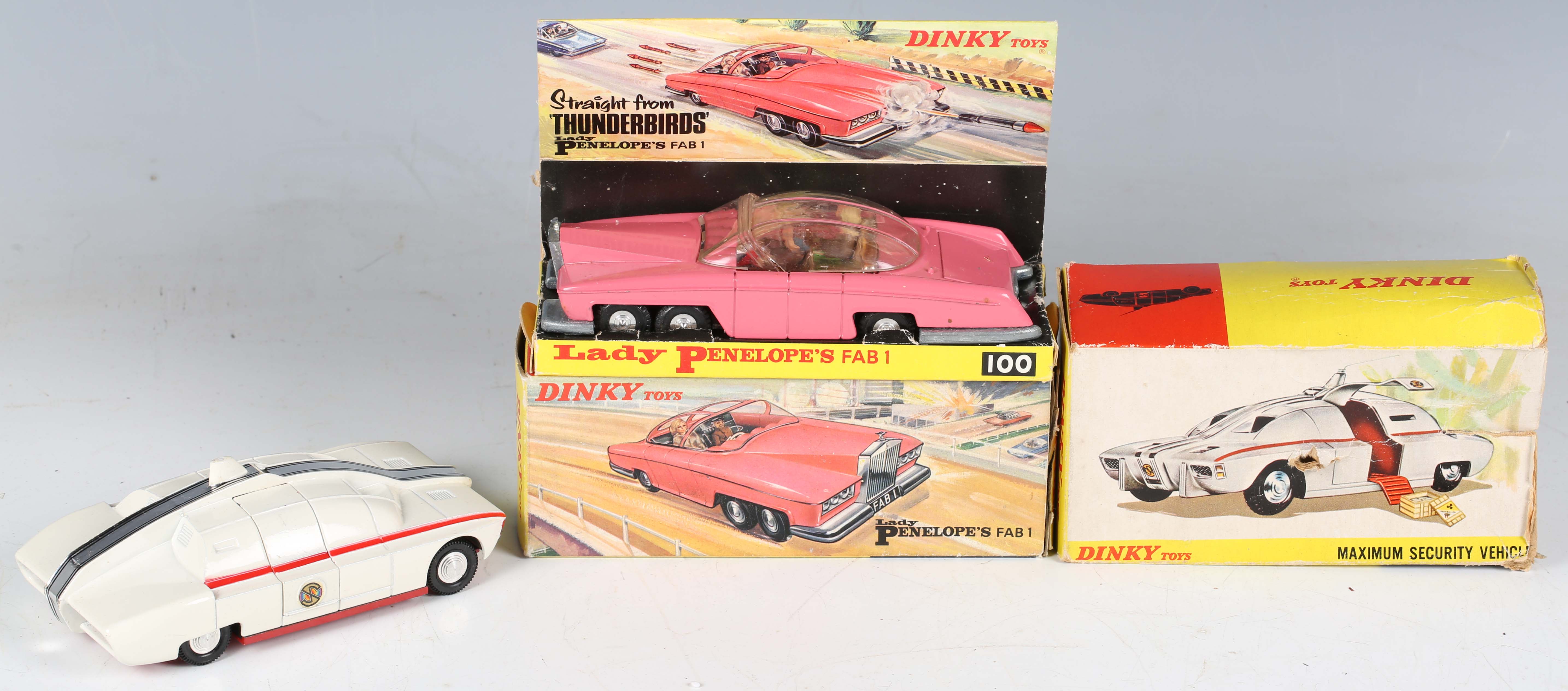 A Dinky Toys No. 100 Lady Penelope’s FAB 1 with Lady Penelope and Parker figures and three harpoons, boxed with diorama, together with a No. 105 maximum security vehicle with crate, boxed (some paint chips, boxes and diorama damaged and graffitied).