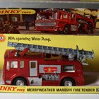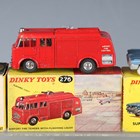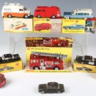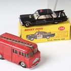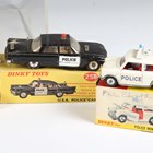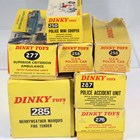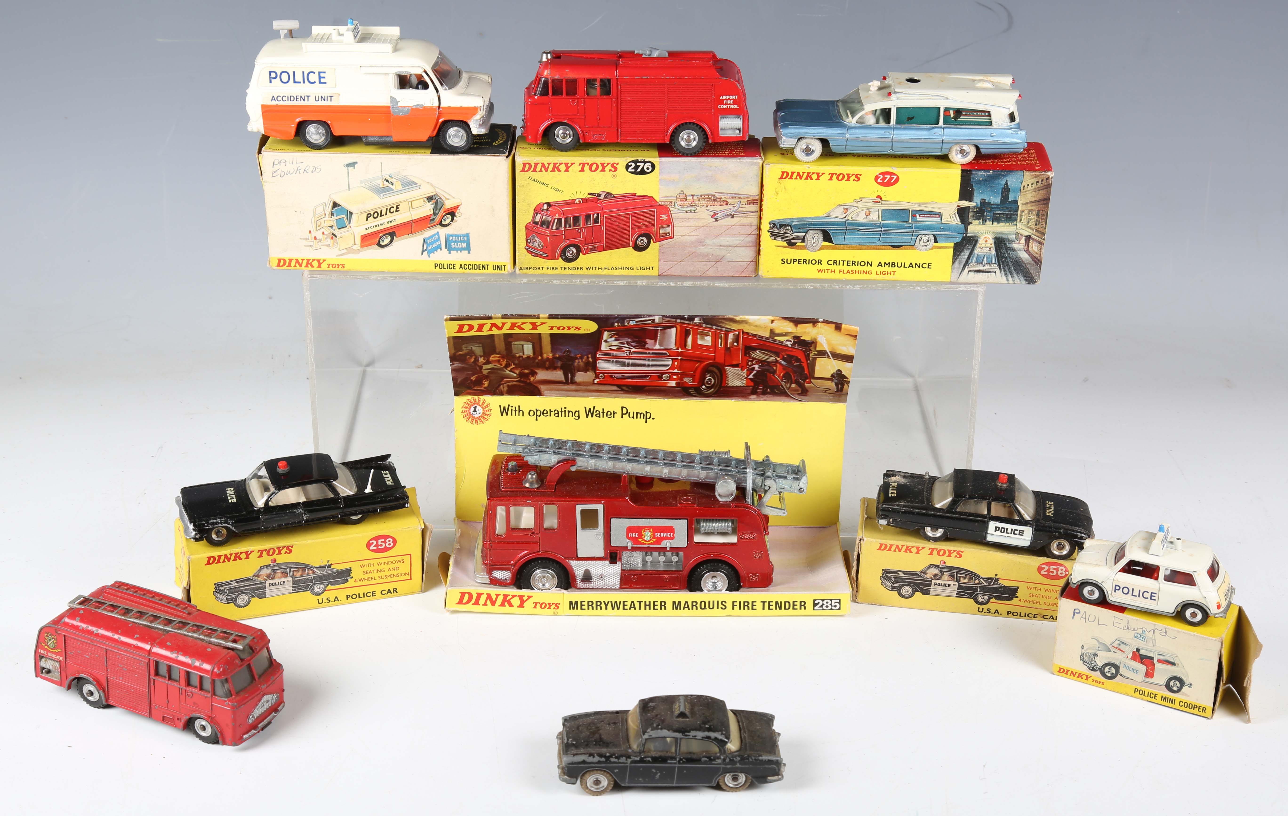A group of Dinky Toys emergency vehicles, comprising No. 285 Merryweather Marquis Fire Tender, No. 276 Airport Fire Tender, No. 287 Police Accident Unit Transit van, No. 250 Police Mini Cooper, two No. 258 USA Police cars, No. 277 Superior Criterion ambulance, all boxed, No. 259 Fire Engine and No. 256 Humber Hawk Police Patrol car (playwear, faults and paint chips, boxes damaged).