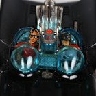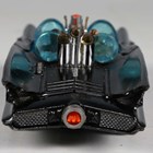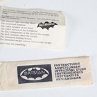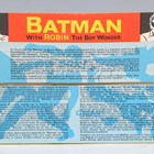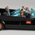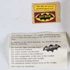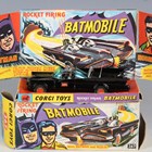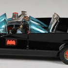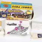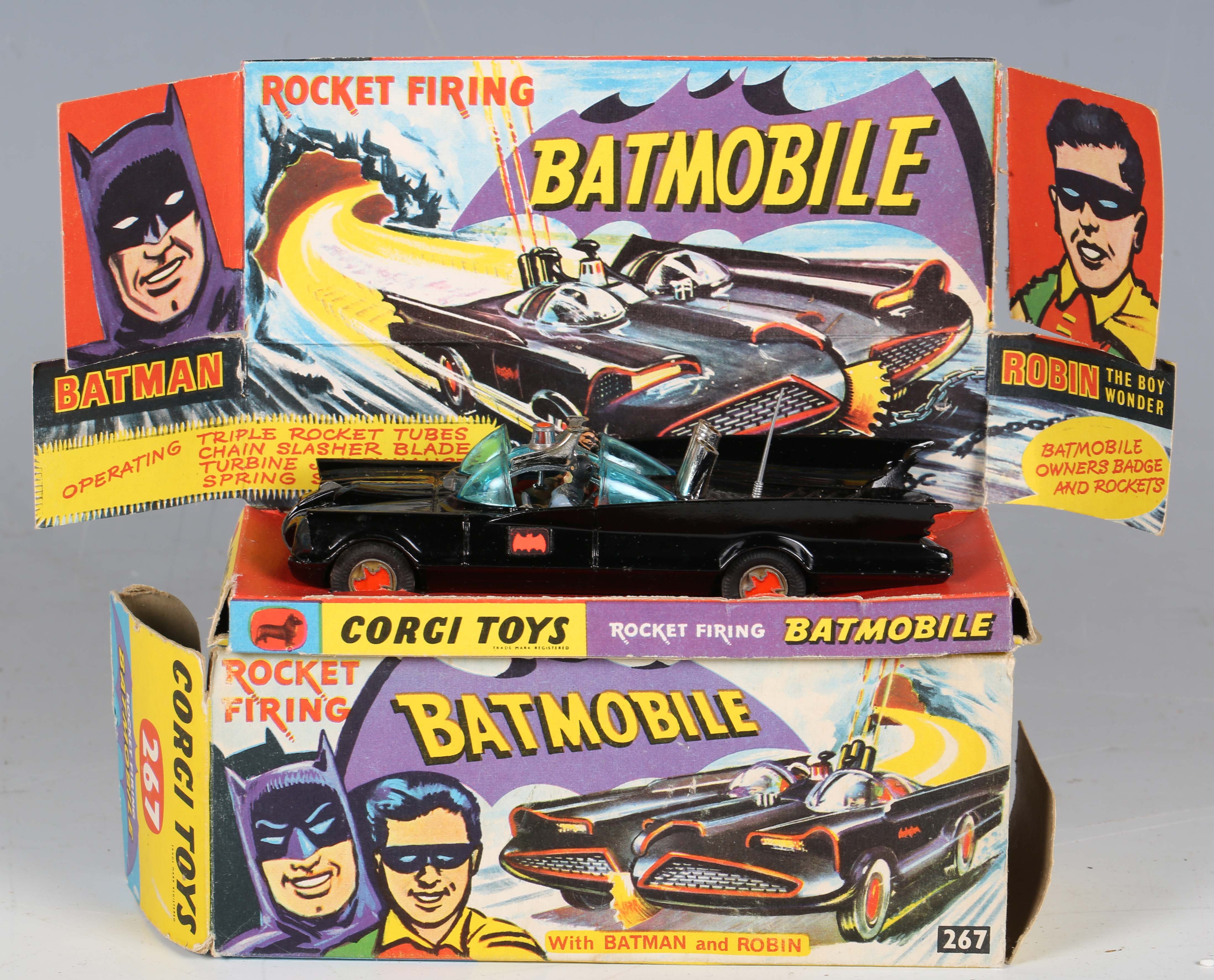 A Corgi Toys No. 267 Batmobile in gloss black with Batman and Robin figures, bat logo on doors and hubs, silver front blade and pulsating red exhaust flame, boxed with diorama, two card packing pieces, rockets (loose), envelope, operating instructions, two detail sheets and lapel badge (minor paint chips to rear of vehicle, box lacking end flap and tab).