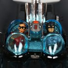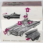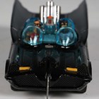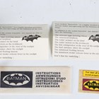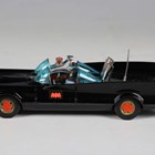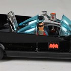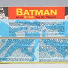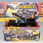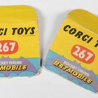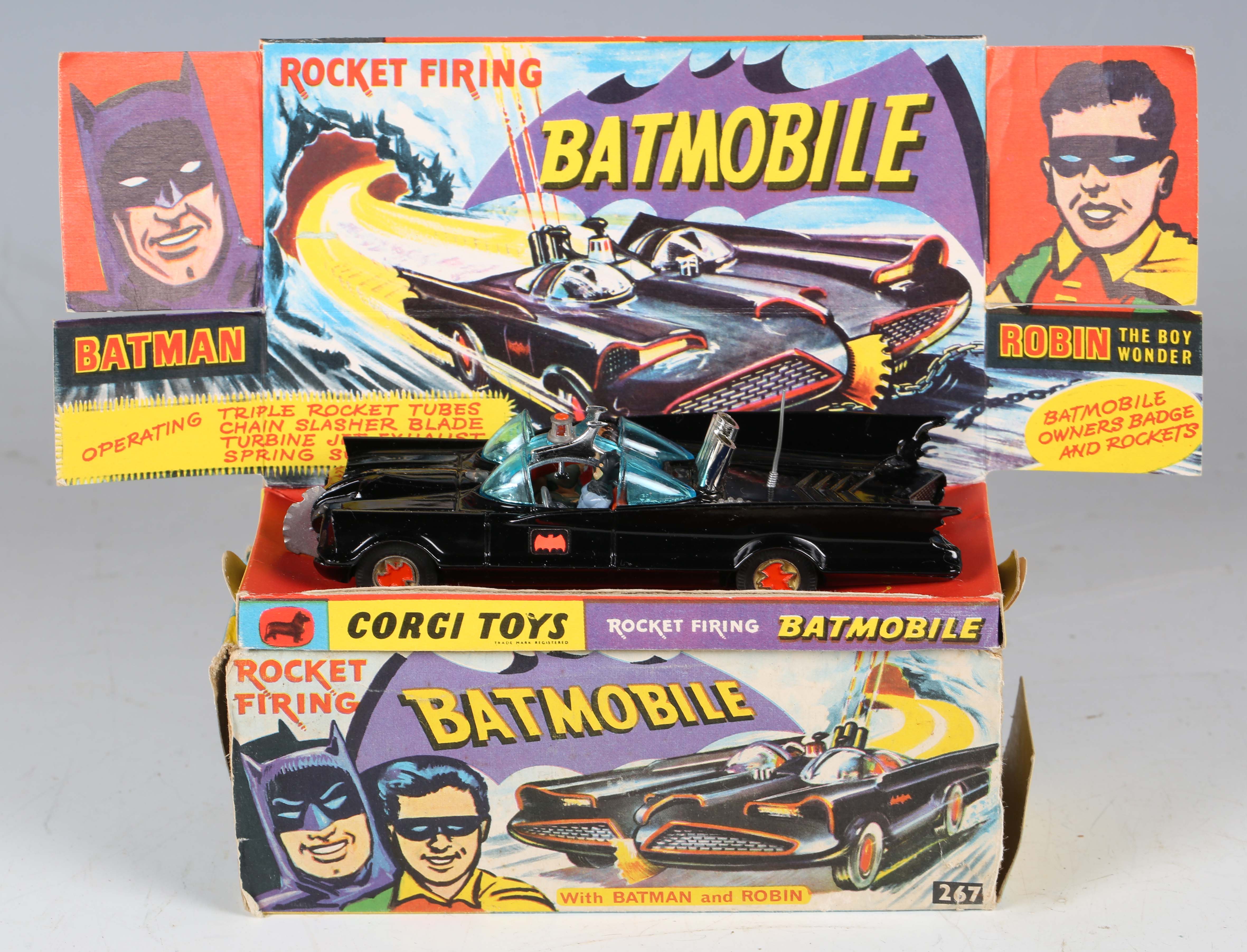 A Corgi Toys No. 267 Batmobile in gloss black with Batman and Robin figures, bat logo on doors and hubs, silver front blade and pulsating red exhaust flame, boxed with diorama, two card packing pieces, rockets on a sprue, envelope, operating instructions, two detail sheets and lapel badge (box torn and scuffed, lacking one end tab and both end flaps detached).