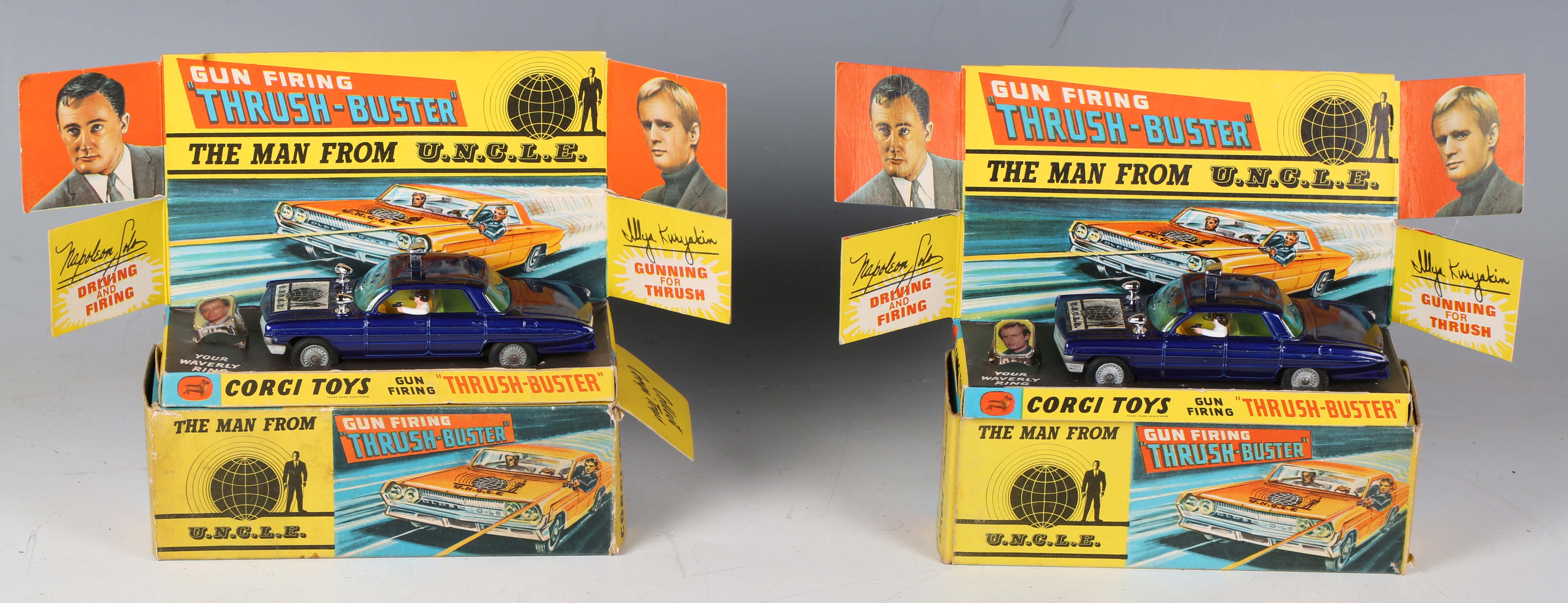 Two Corgi Toys No. 497 The Man from UNCLE Thrush Buster, both boxed with diorama, Waverley ring, packing pieces and a club membership form (boxes creased, scuffed and torn).