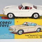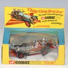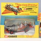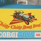 Three Corgi Toys TV and film cars, comprising No. 266 Chitty Chitty Bang Bang, No. 261 James Bond’s Aston Martin DB5, with instructions and bandit figure, and No. 258 The Saint's Car Volvo P.1800, all boxed (playwear and paint chips, Saint's car missing bonnet logo, boxes damaged).