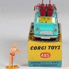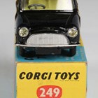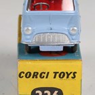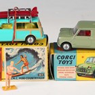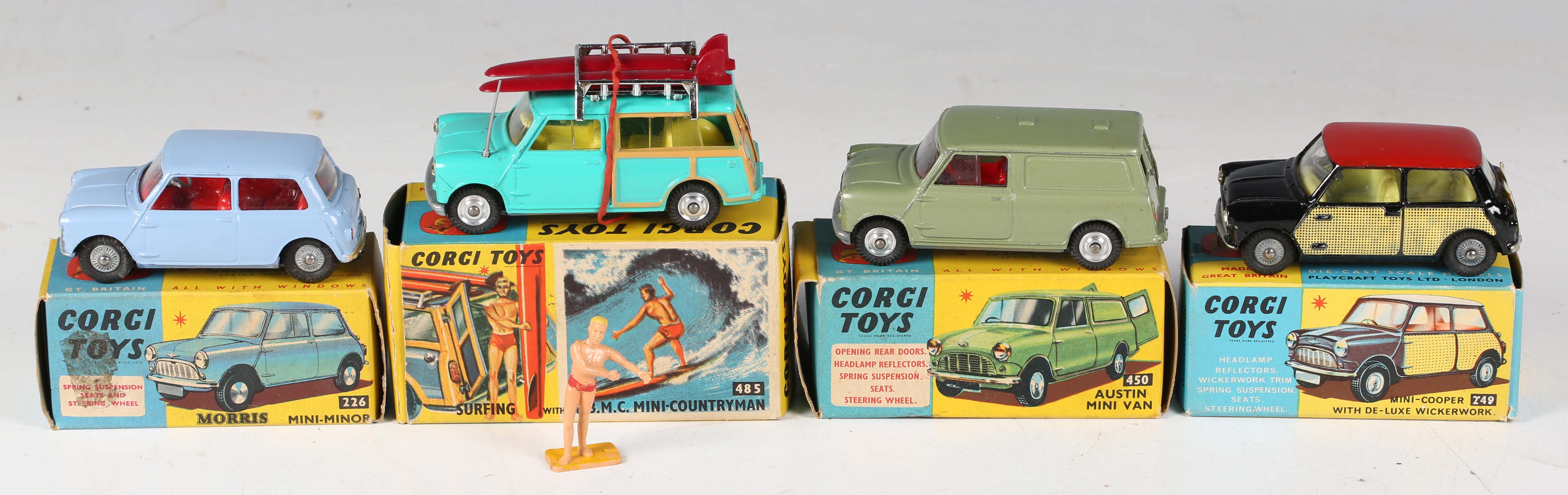 Four Corgi Toys Minis, comprising No. 485 Surfing with the BMC Mini Countryman, No. 249 Mini-Cooper with De-Luxe Wickerwork, No. 450 Austin Mini van and No. 226 Morris Mini-Minor, all boxed (paint chip to Mini van, boxes lightly creased and scuffed).