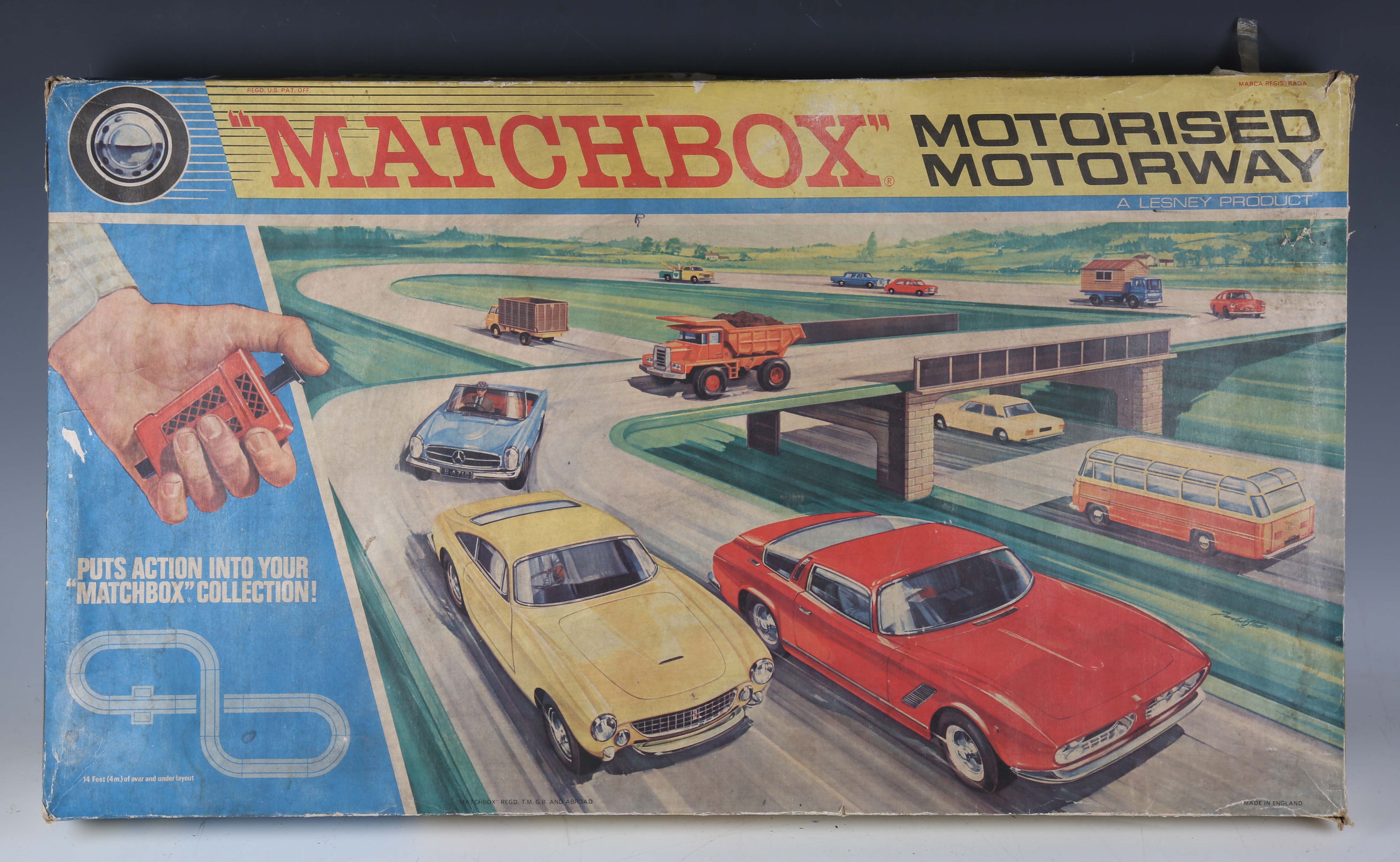 A Matchbox M-1 Motorised Motorway, together with an M-2 set, an M-3 ‘Switch a track’ and an E-2 Extension Set, all boxed (unchecked, boxes creased, torn and scuffed).