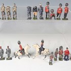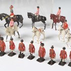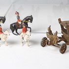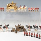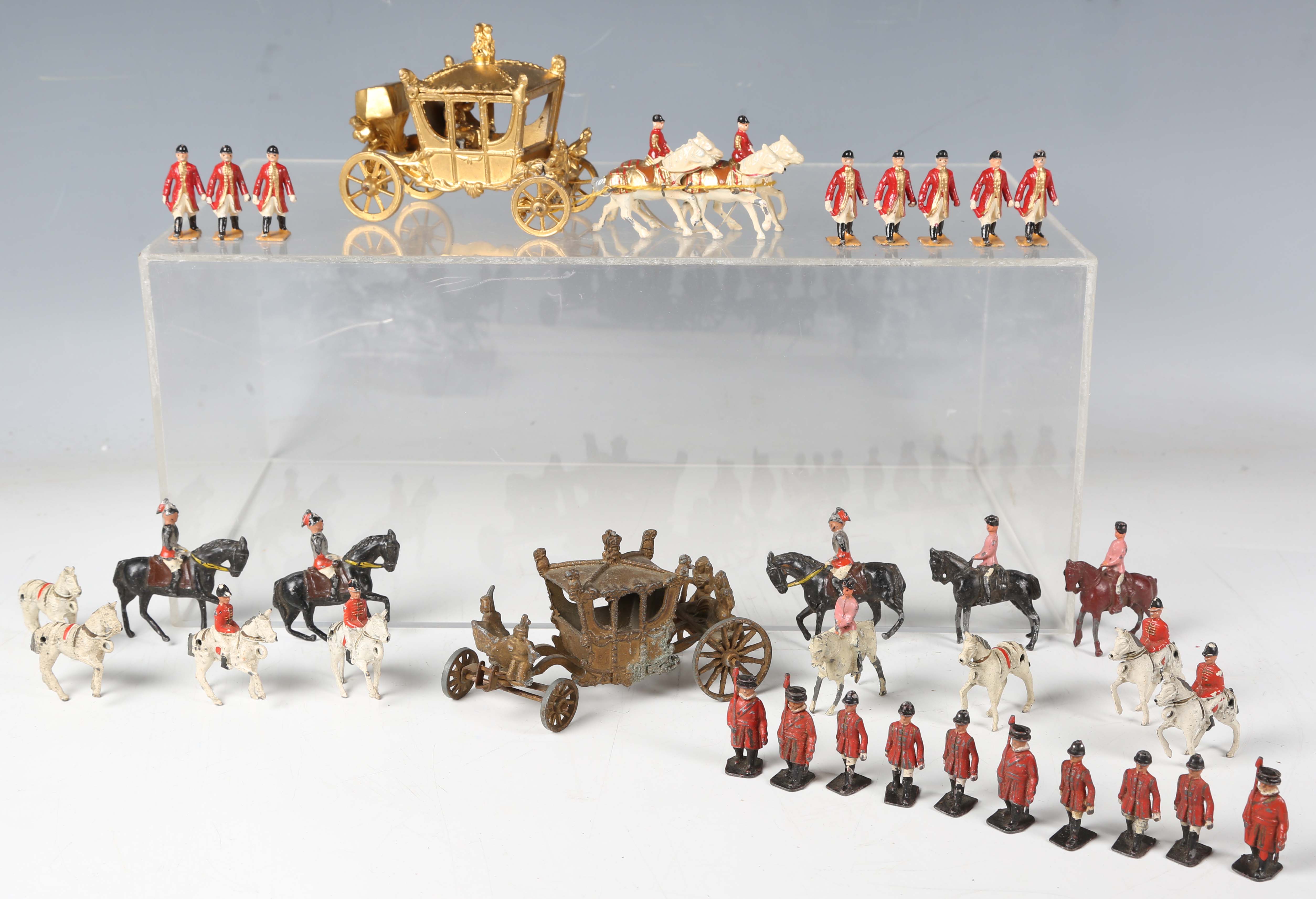 A Johillco lead coronation coach, a Crescent coronation coach, a Crescent Coronation coach, footmen and lifeguards, and a group of Britains lead soldiers and mounted infantry (playwear, faults and parts missing).