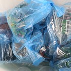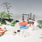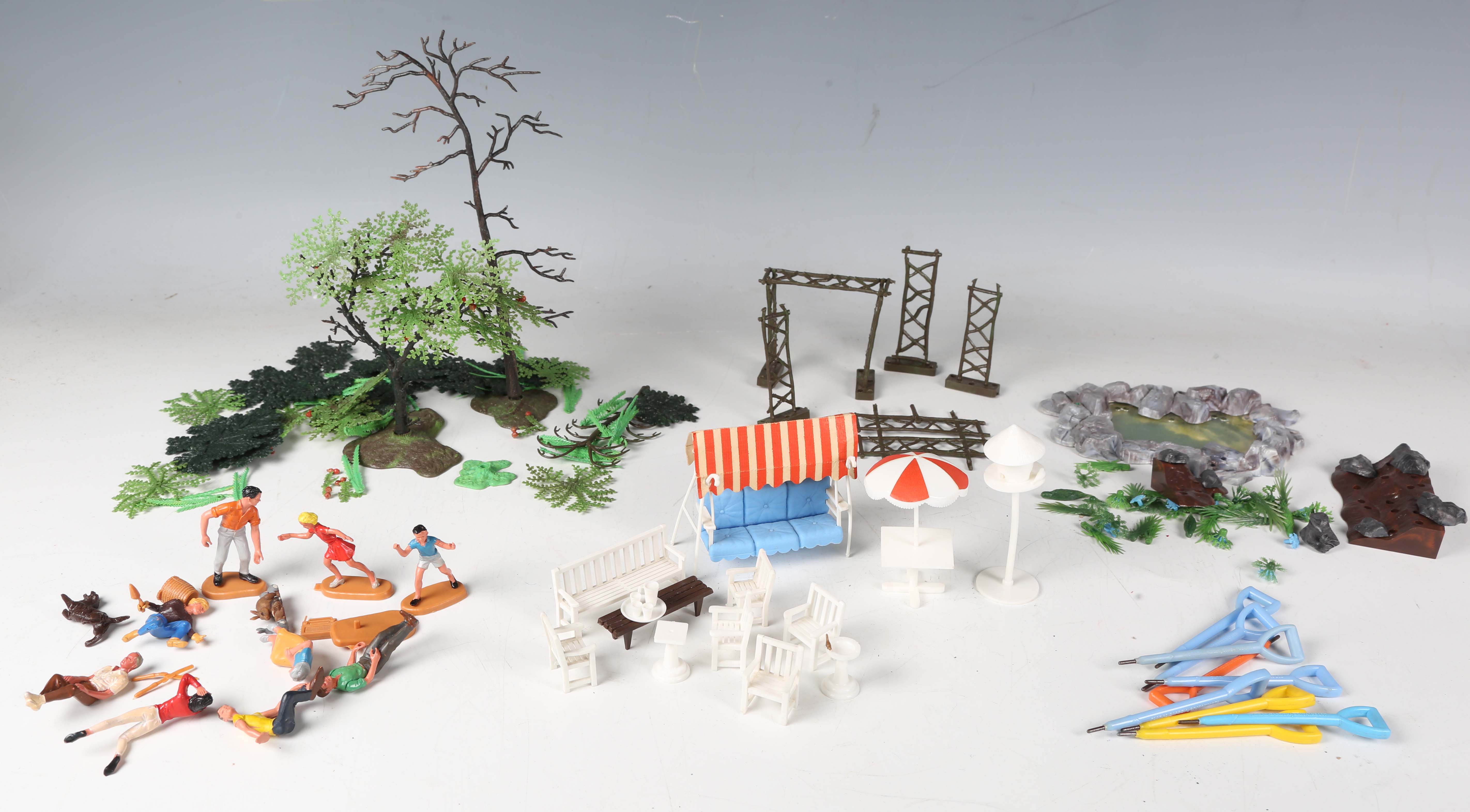 A collection of Britains plastic Garden Series items, including trees, flowers, fence panels, pond, paving, greenhouse, figures and accessories.