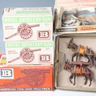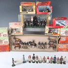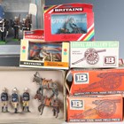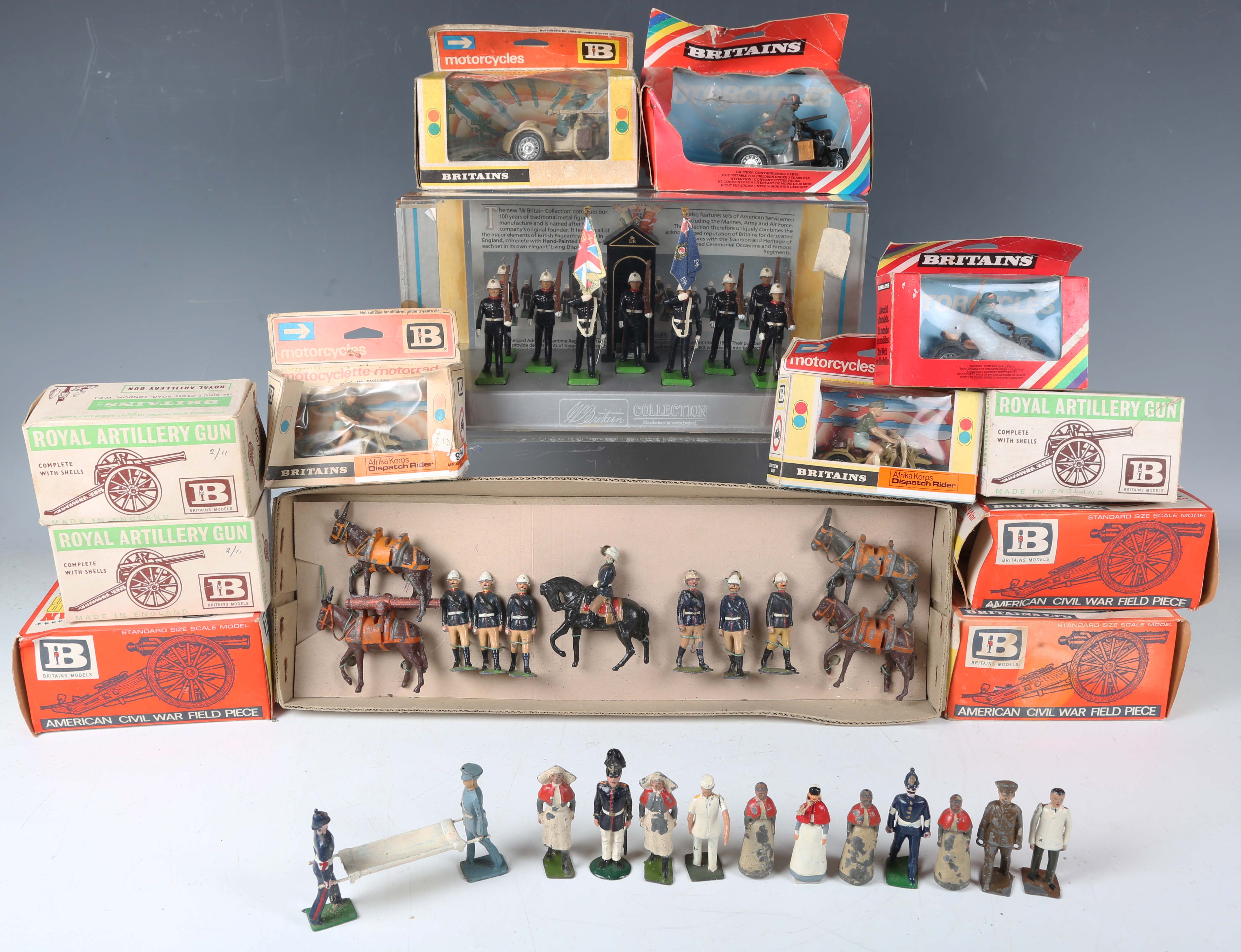 A group of Britains diecast lead figures and accessories, including three No. 9700 Royal Artillery Gun sets, No. 28 Mountain Artillery (no loads), three No. 9726 American Civil War field guns, marines, marching a slope, other military figures and motorcycles, majority boxed (playwear, boxes creased, torn and scuffed).