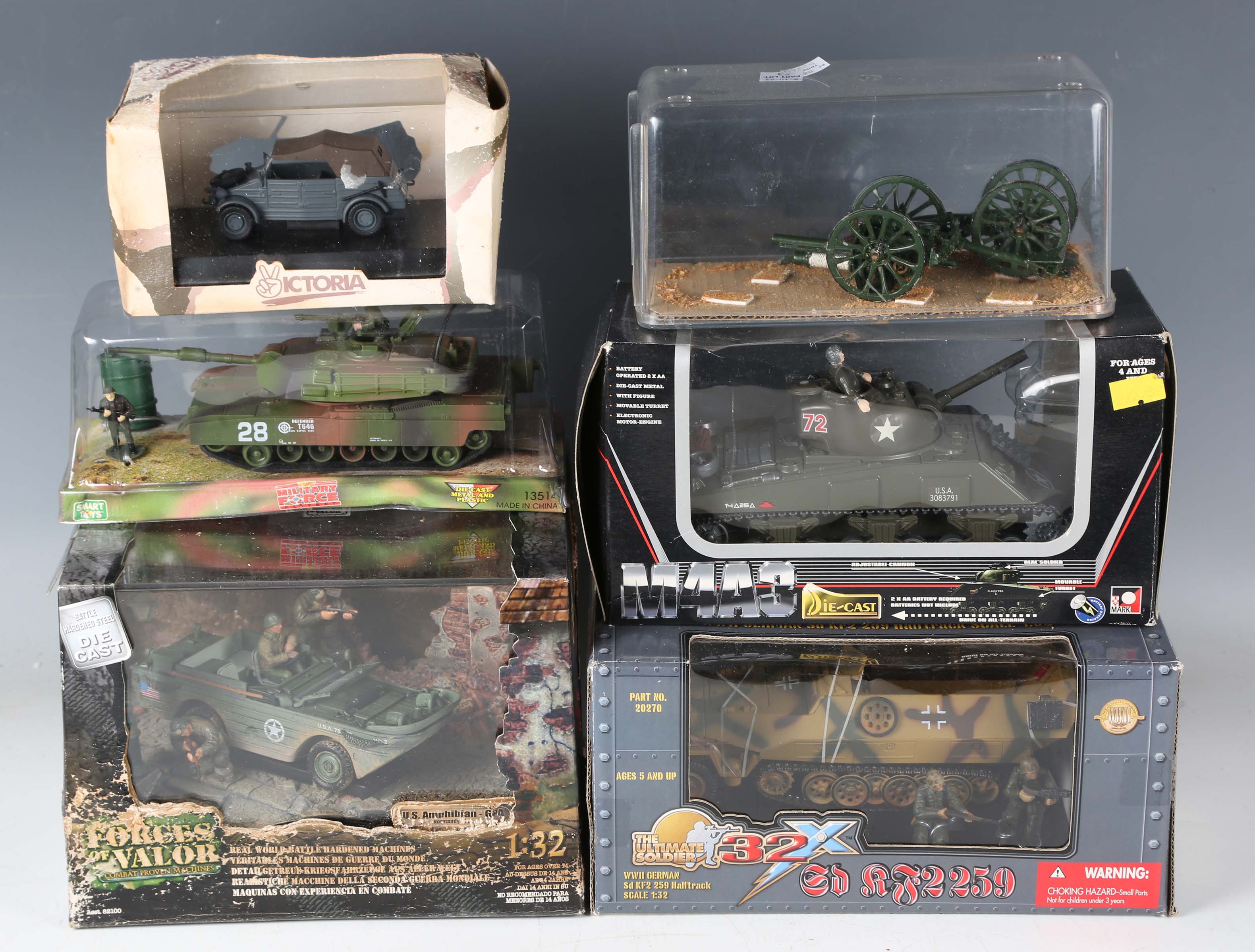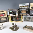 A collection of diecast metal military figures, vehicles and accessories, including Corgi Forward March figures, Del Prado and other Napoleonic and later figures, model cannons and military vehicles, majority boxed.