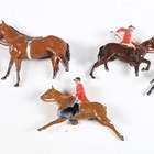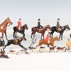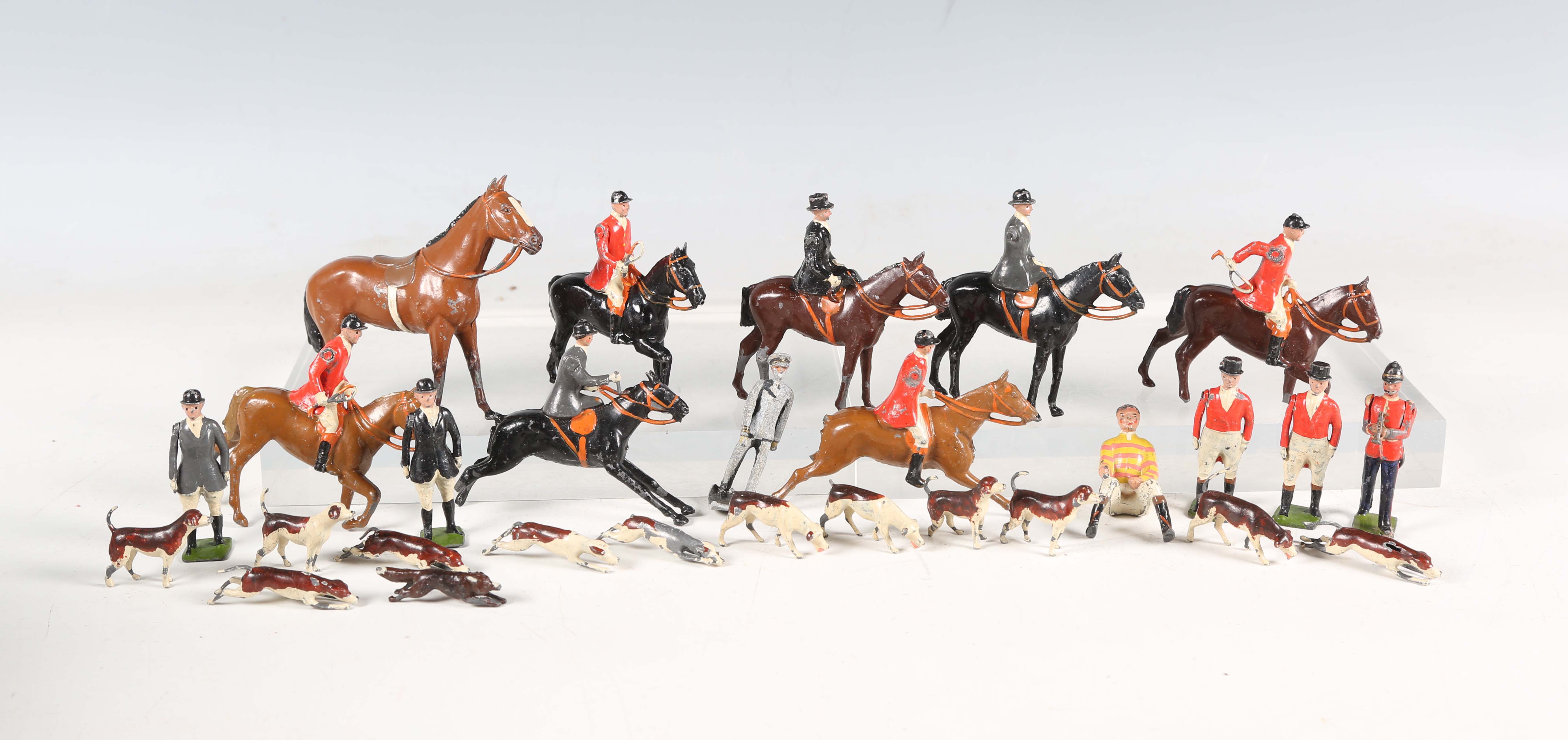 A group of Britains diecast lead hunting series figures, including huntsmen, ladies riding side saddle, standing figures, eleven hounds and a fox, together with a Britains Racing Colours of Famous Owners horse and jockey (playwear, damage and parts missing).