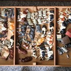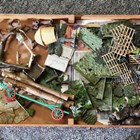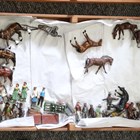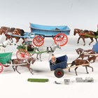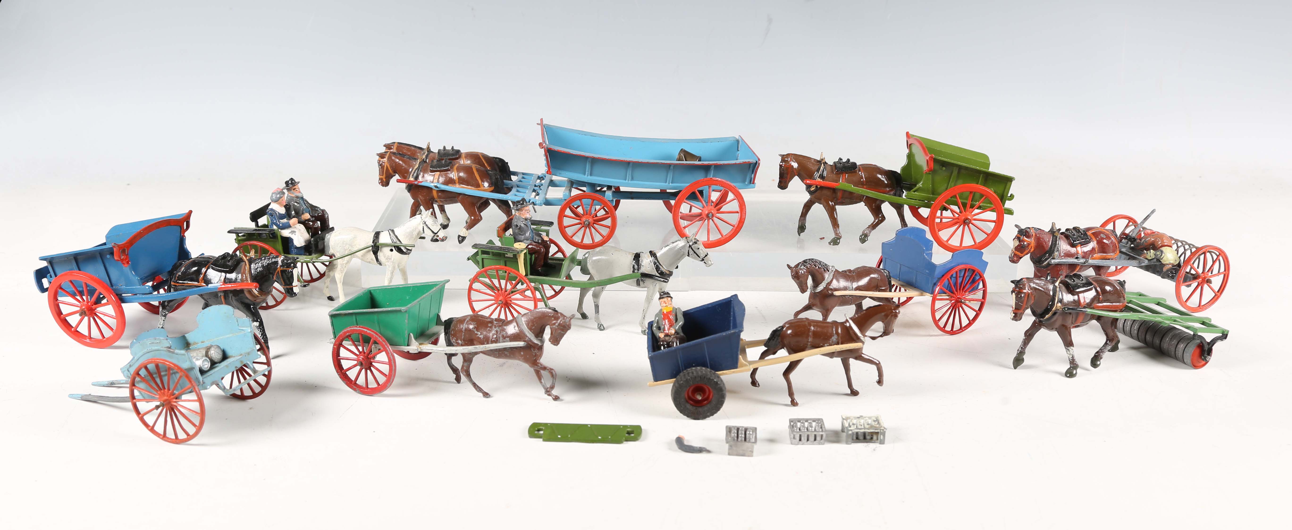 A good collection of Britains and other lead farm animals, figures and accessories, including No. 20F farmer's gig, lumber cart, farm wagon, horse and roller, horse and rake, farm workers, farmer, animals and troughs (some playwear and faults).