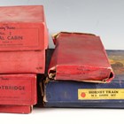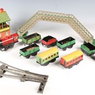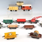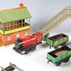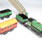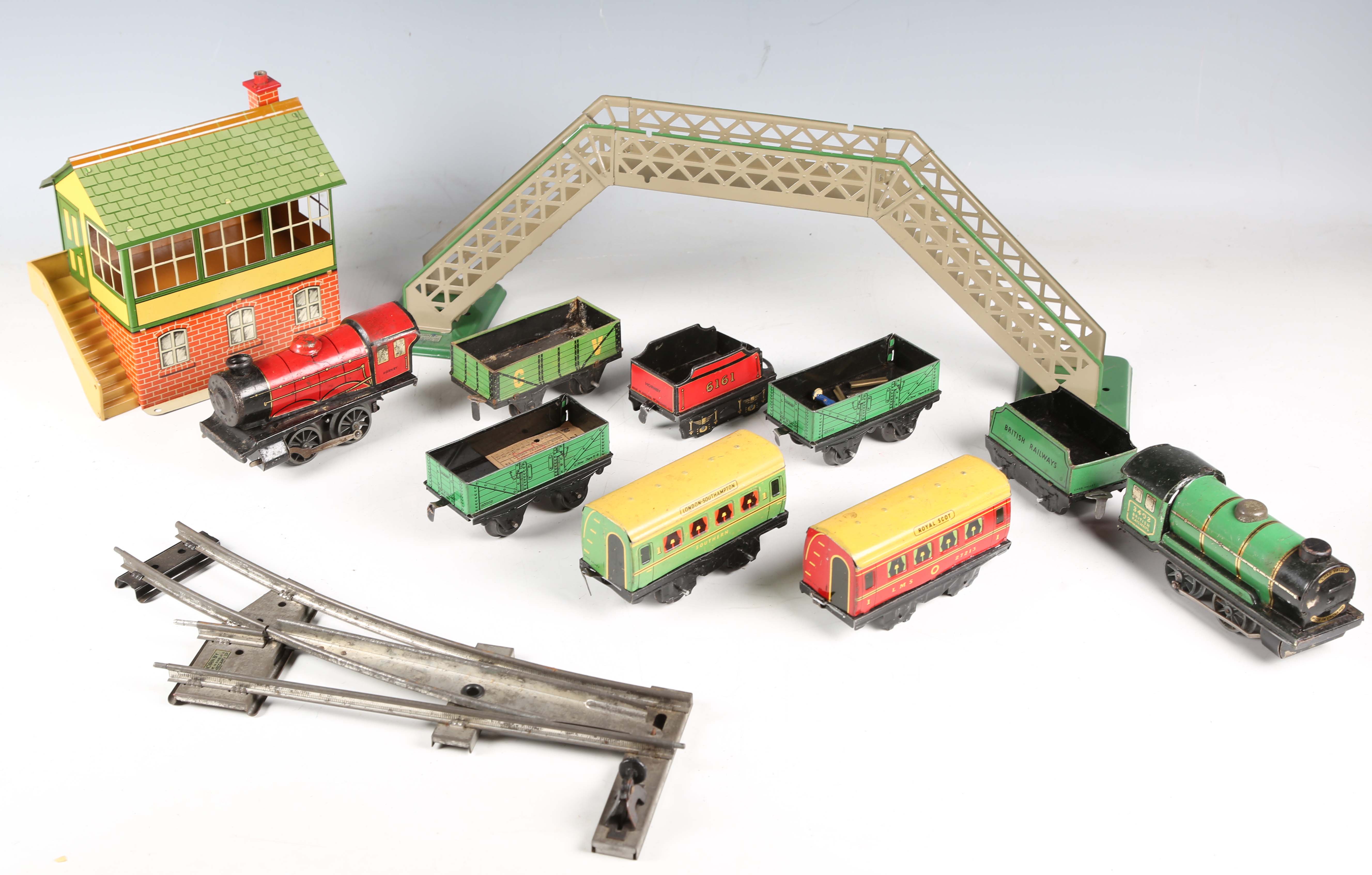 A group of Hornby O gauge railway items, including MO goods train set, Southern cattle truck 2435, cable truck, other goods wagons, No. 1 footbridge and No. 2 signal cabin, set of points, together with a Chad Valley clockwork locomotive, tender and two coaches (playwear).