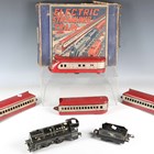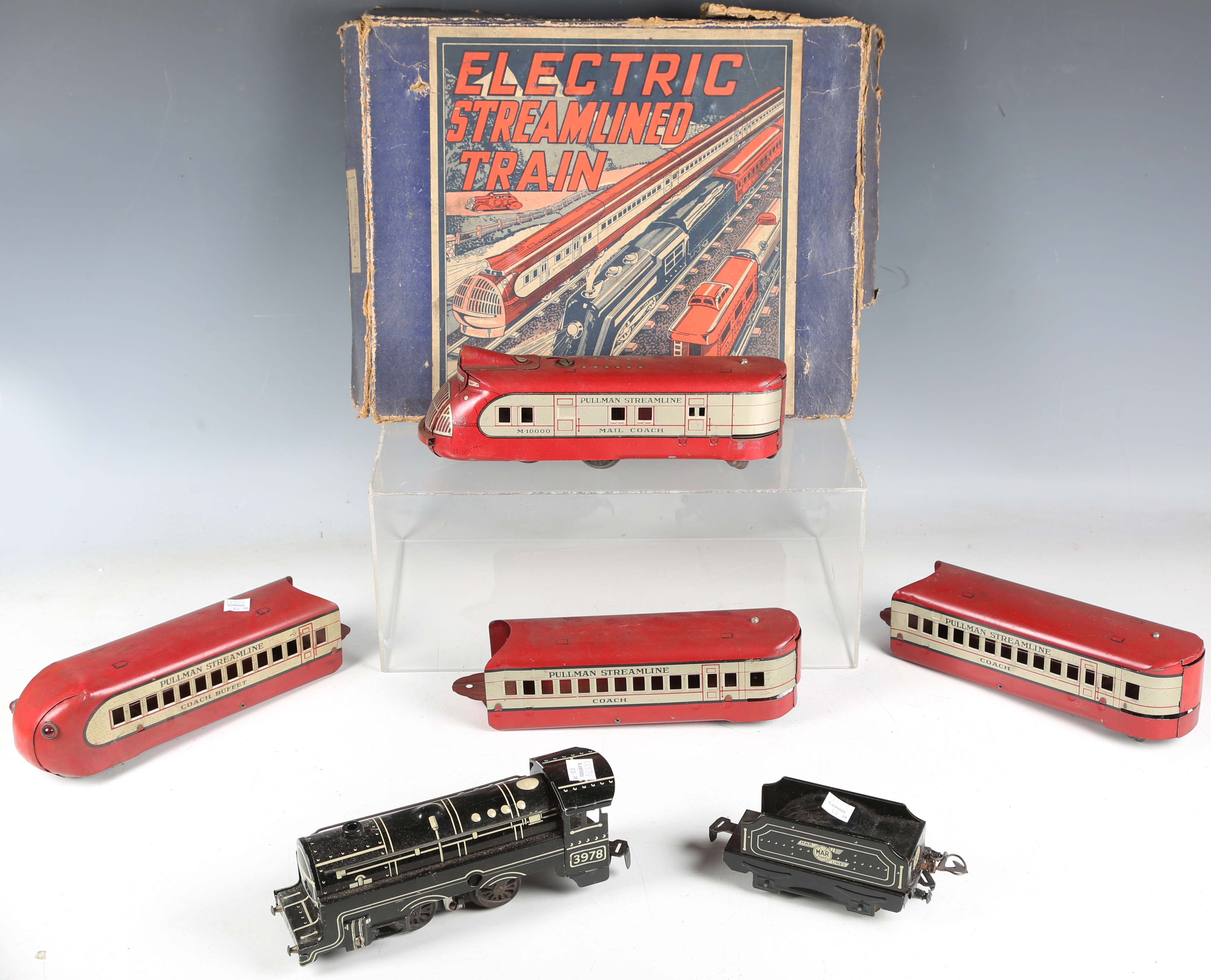 An O gauge No. 251 Electric Streamlined Train, comprising American outline diesel locomotive and three coaches, boxed, together with a Marx O gauge locomotive and tender, track and accessories.