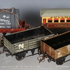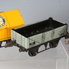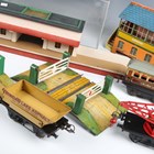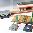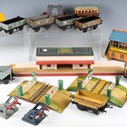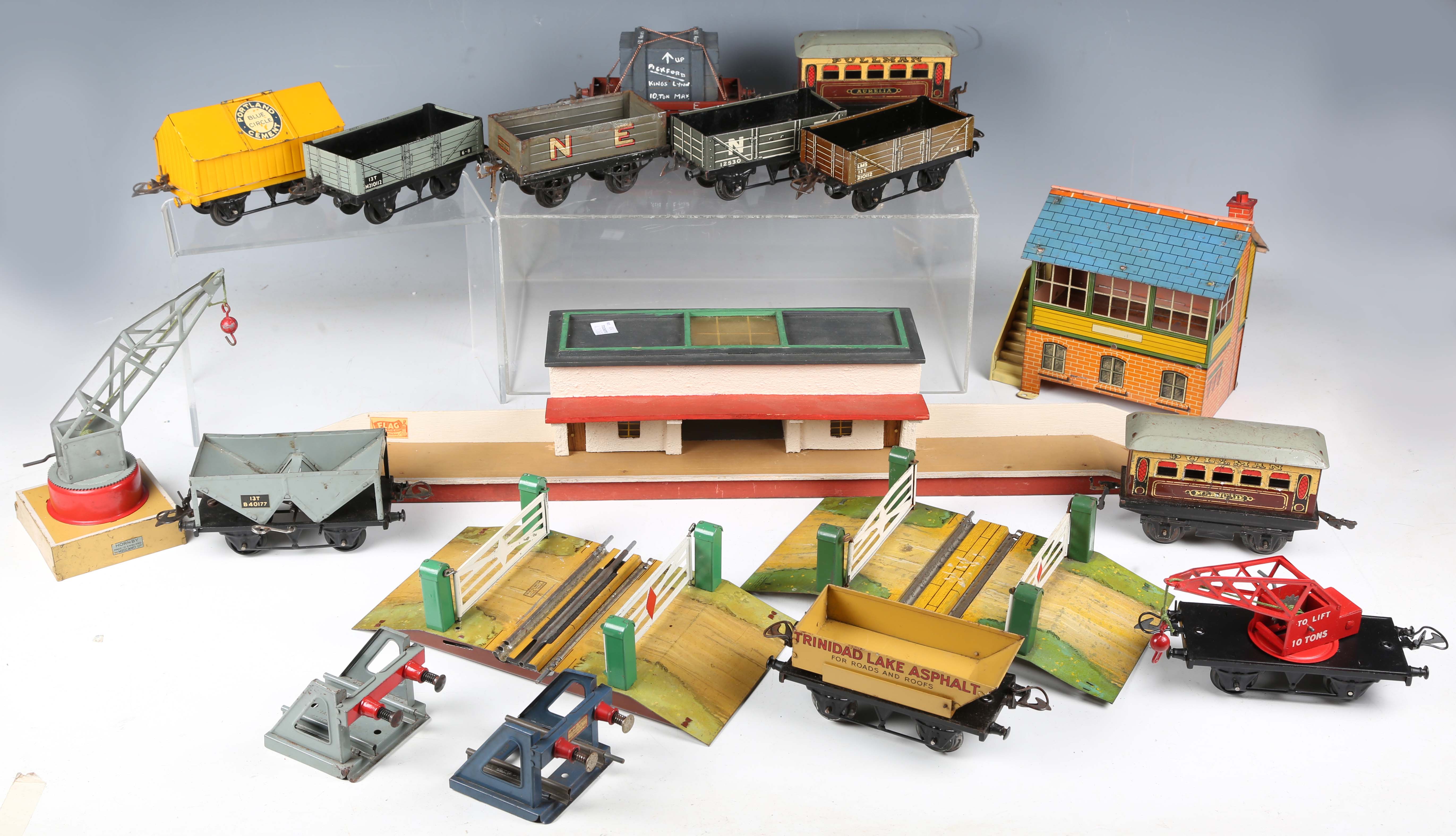 A group of Hornby O gauge railway items, including No. 1 crane truck, boxed, other rolling stock, two Pullman coaches, platform crane, signal box, two level crossings and two buffers, together with a Hugar wooden station.