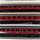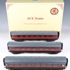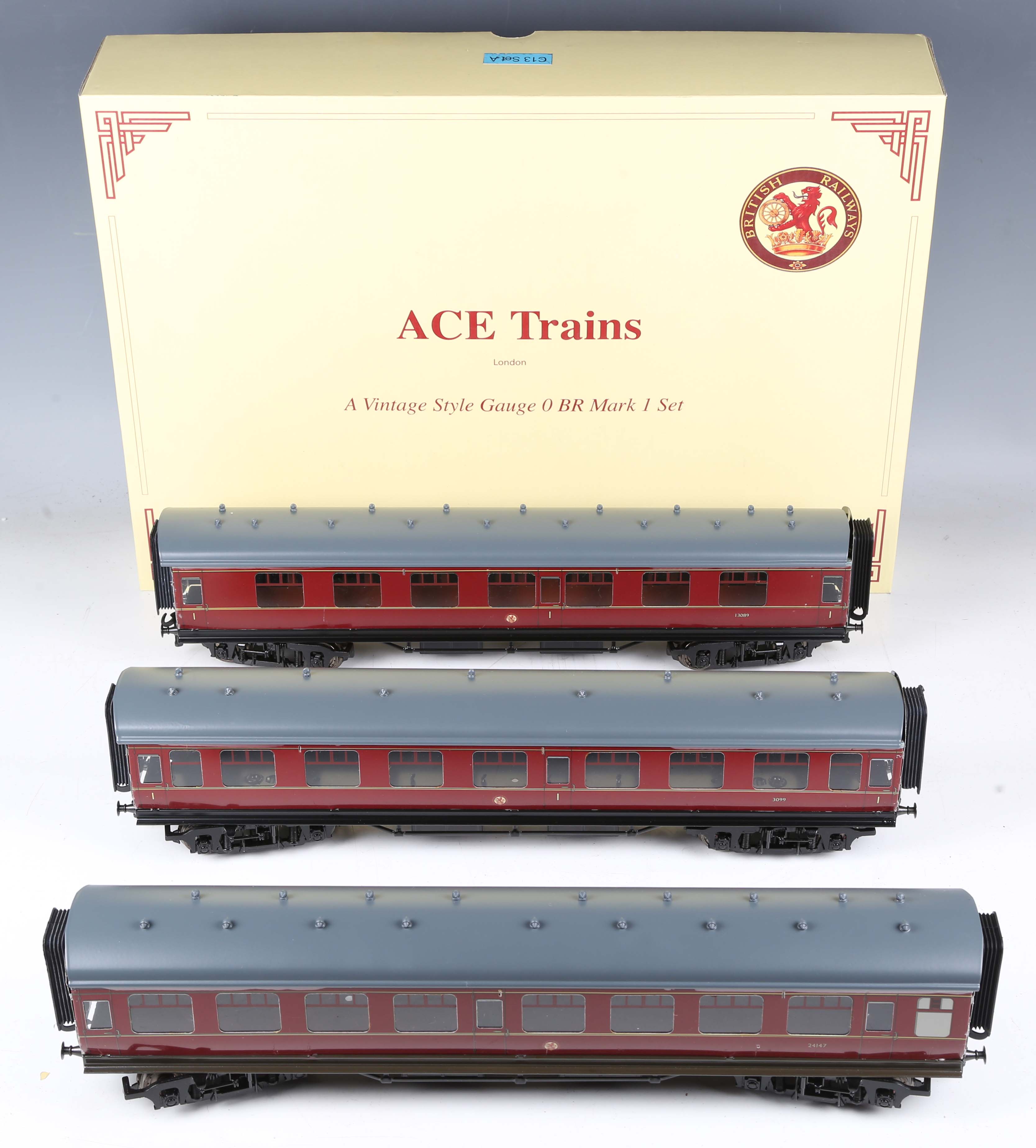 An ACE Trains O gauge BR Mark 1 set of three coaches in maroon, comprising 1st 3099, 1st 13089 and corridor coach 24147, boxed.