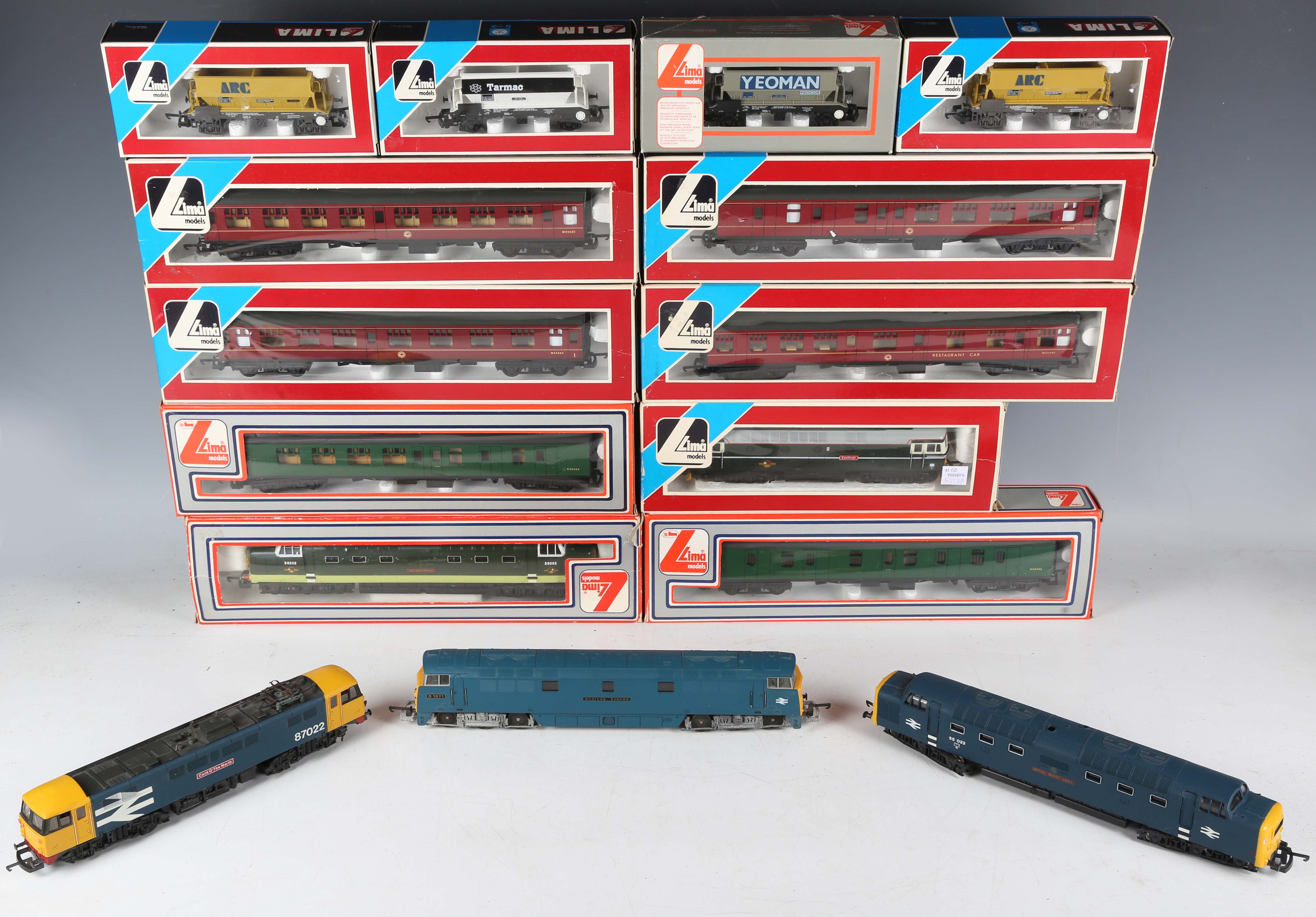 A collection of Lima OO gauge railway items, including No. 205221 Class 33 diesel locomotive 'Eastleigh' in BR green, No. 205105 Deltic D9008 'The Green Howards', four other locomotives, coaches and goods rolling stock, boxed and loose.
