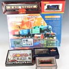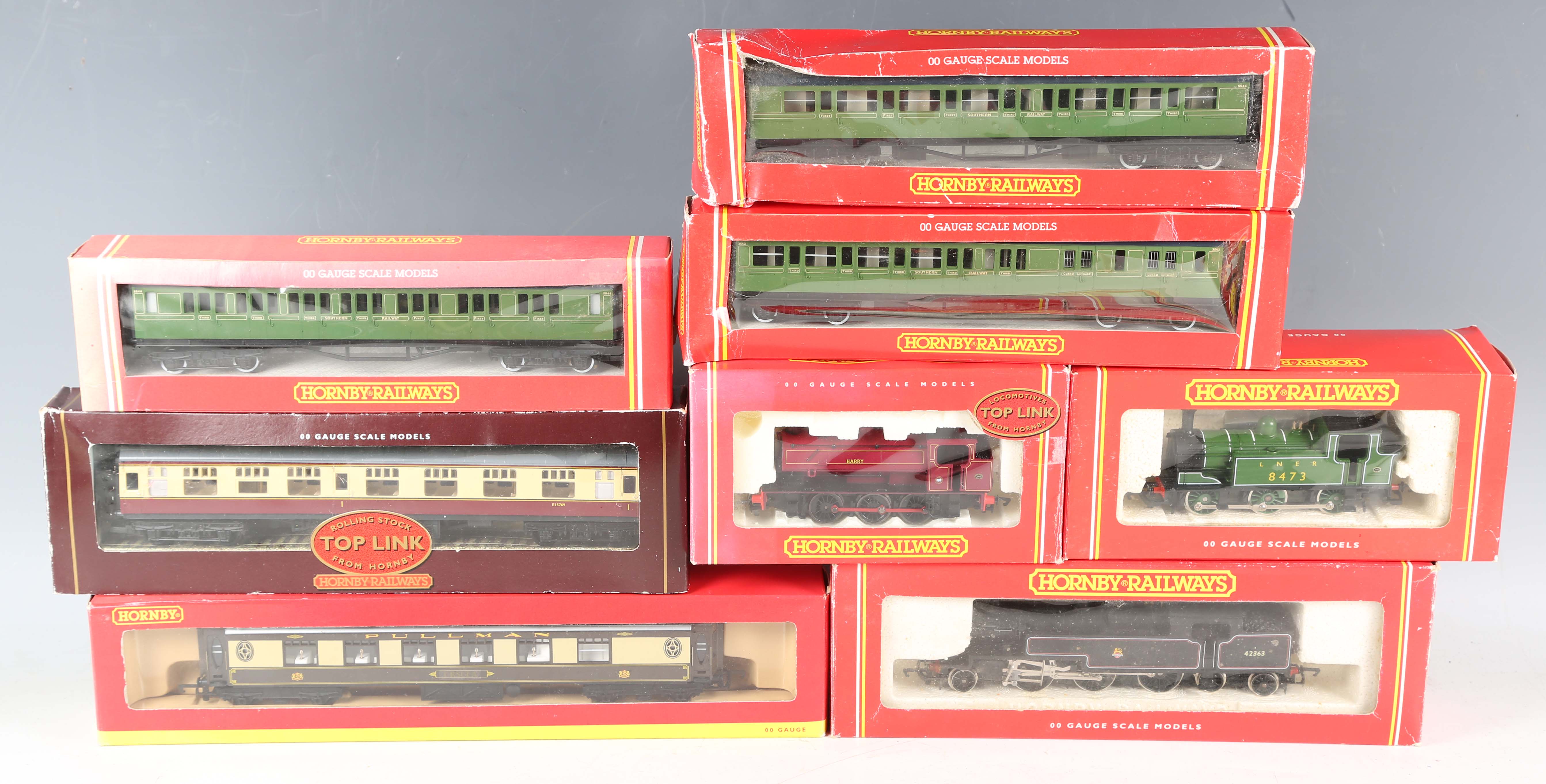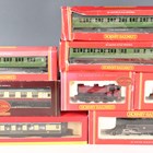 A group of Hornby OO gauge railway items, including R.317 Schools Class V locomotive ‘Westminster’ and tender, R.310 Battle of Britain Class locomotive ‘Lord Beaverbrook’ and tender, six tank locomotives, coaches, goods rolling stock and R.905 Industrial Freight train set, all boxed (no track mat, boxes lightly creased and scuffed), together with a quantity of lineside buildings, accessories and track.