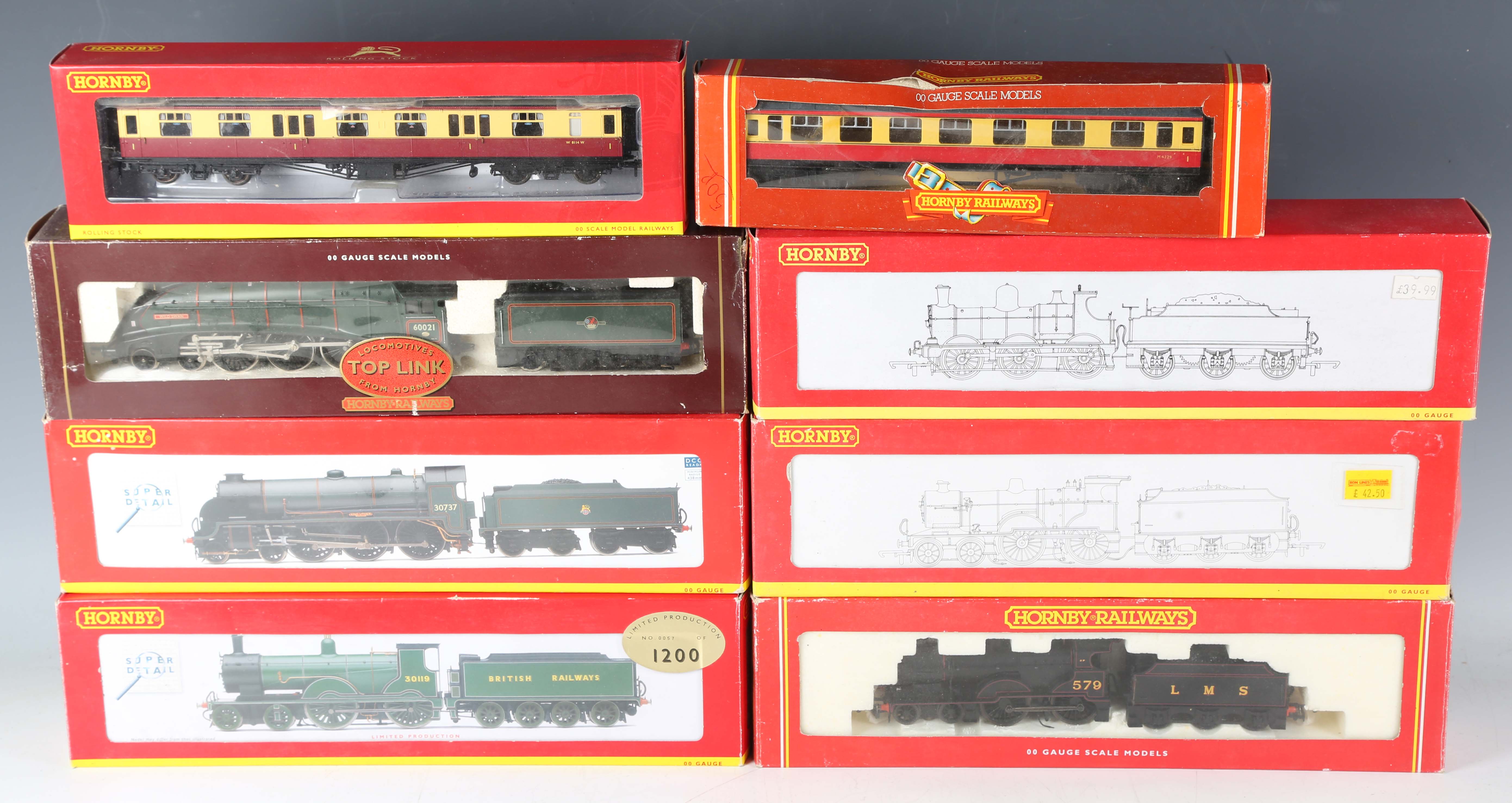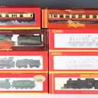 A group of Hornby and Hornby Railways OO gauge items, including R.2889 Collector Centre Special Class T9 locomotive 30119 and tender, R.2623 King Arthur Class N15 locomotive 30737 ‘King Uther’ and tender, five other locomotives and tenders and three coaches, all boxed (unchecked, some boxes damaged).