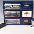 Four Bachmann Branch-Line OO gauge locomotives and tenders, comprising No. 31-776 7915 'Mere Hall', No. 31-826 6384 in BR plain green with late crest, No. 31-561 V2 60825 in BR lined green, all boxed, and locomotive 2203 in BR black, together with a No. 33-452 three plank wagon in BR brown, boxed.