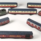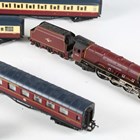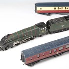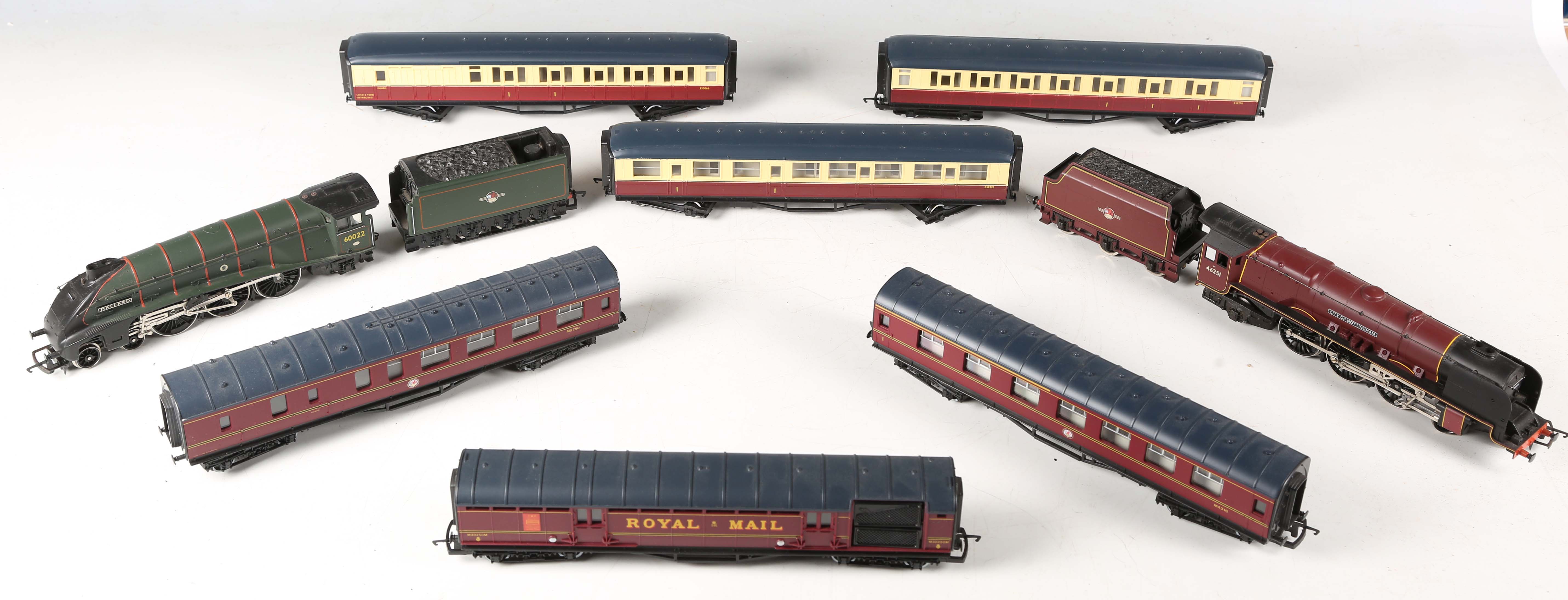 A Hornby OO gauge A4 locomotive 60022 'Mallard' and tender in BR green and three coaches, together with a locomotive 46251 'City of Nottingham' and tender, a Royal Mail coach and two further coaches.