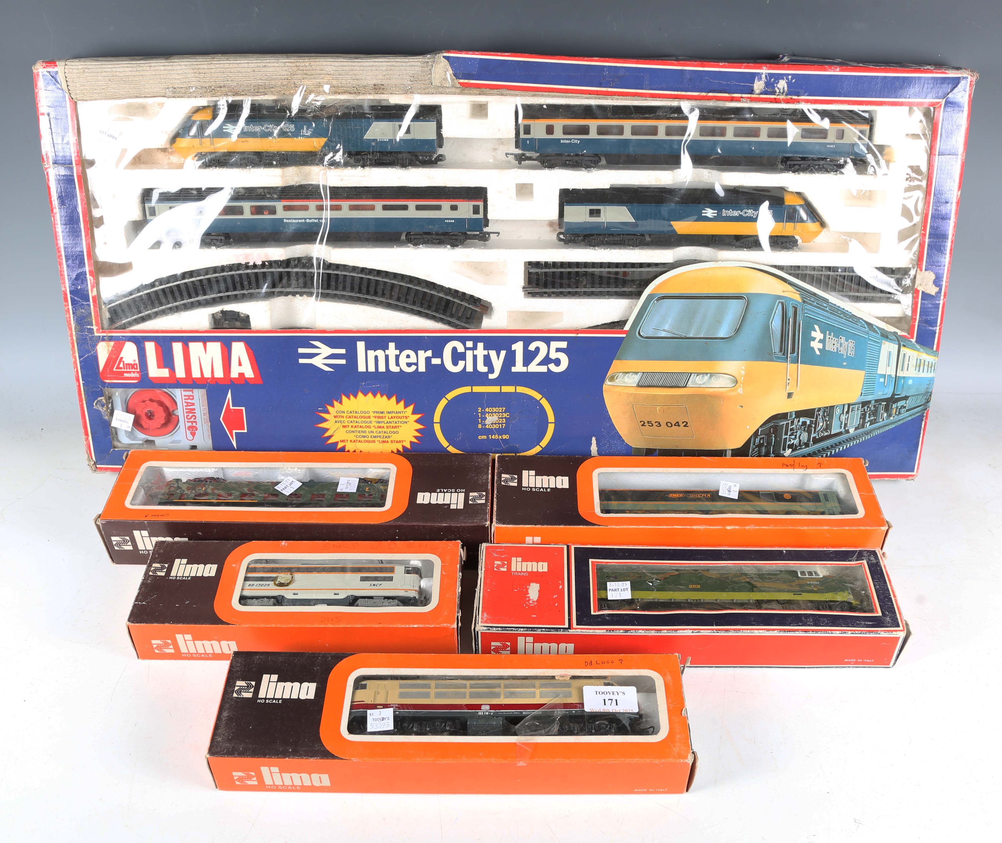 A group of Lima HO scale railway items, including Deltic locomotive D9003 'Meld', two continental diesel locomotives, Inter-City 125 train set, tank locomotive Great Western, five coaches, 0-6-0 diesel locomotive and level crossing set, majority boxed (playwear and faults, boxes damaged).