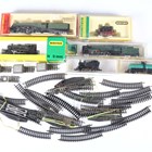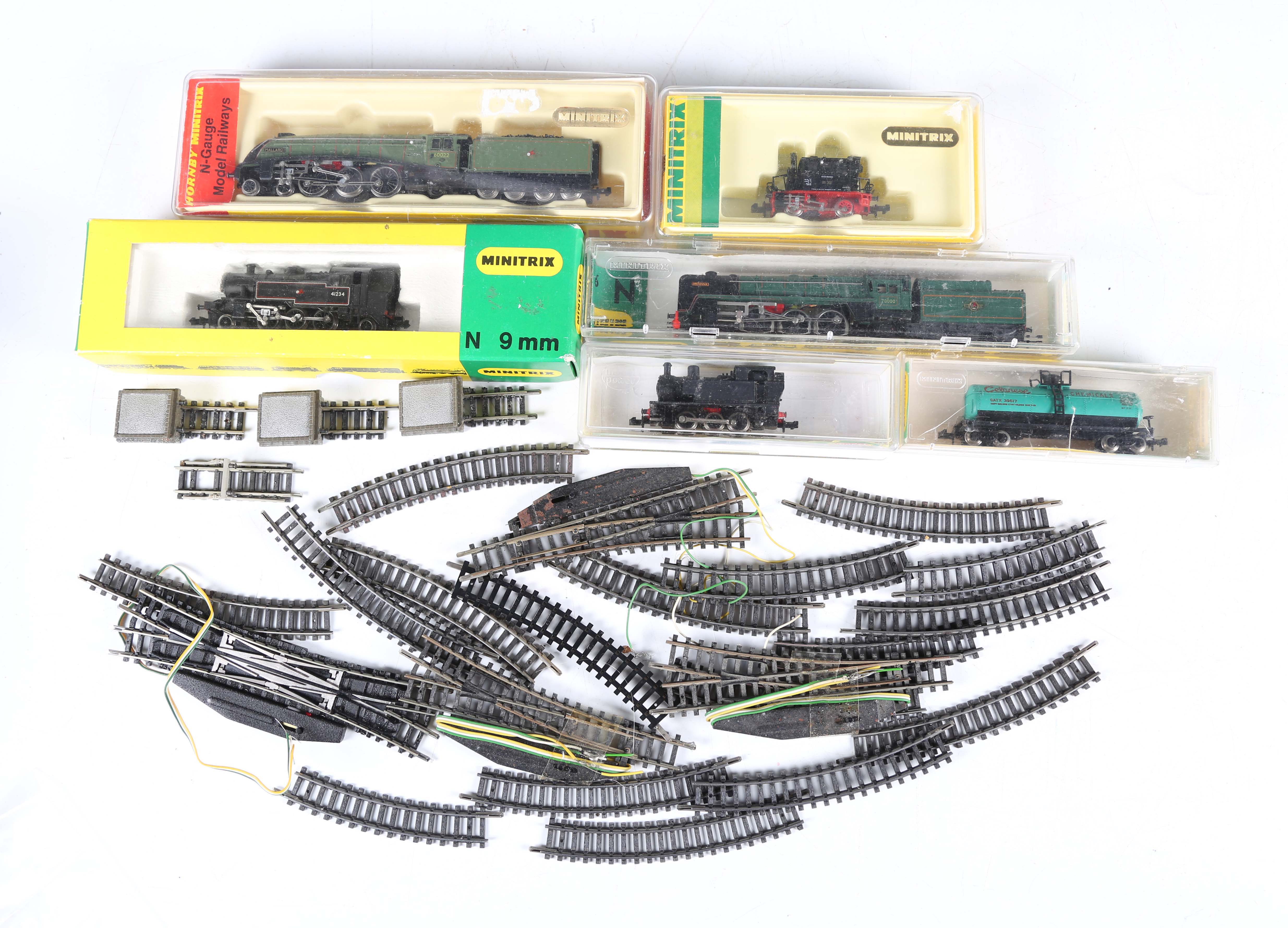 A small group of Minitrix N gauge railway items, comprising No. 211 locomotive 'Mallard' and tender, locomotive 'Britannia' and tender, two tank locomotives and tanker ‘Calenese Chemicals’, together with another tank locomotive, possibly Trix, and a quantity of Trix track.