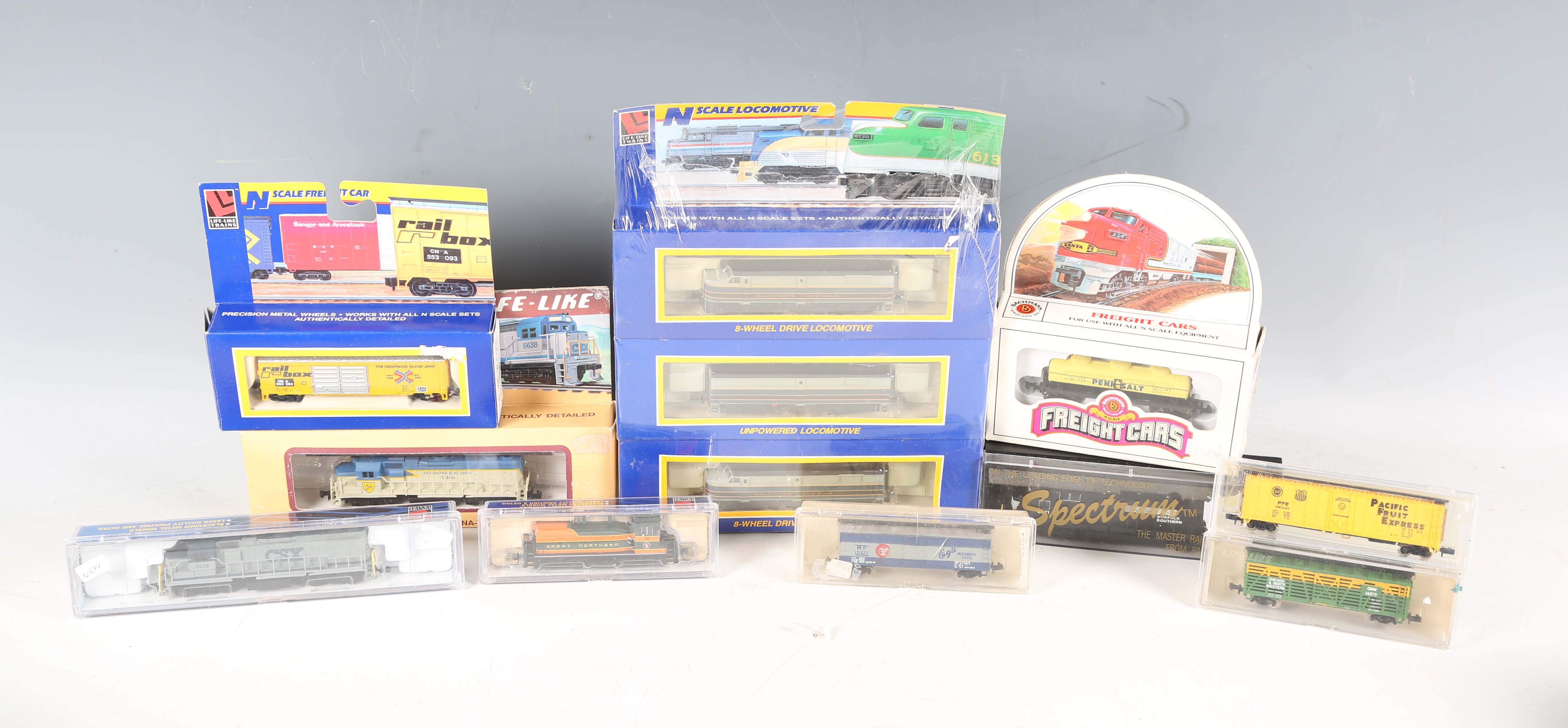 A collection of N gauge American outline locomotives, coaches and goods rolling stock, including Life-Like Trains No. 7842 diesel locomotive 6638, CSX No. 7880 diesel locomotive Great Northern, No. 7962 eight wheel drive triple pack locomotive set, Spectrum diesel locomotive 8671 in Norfolk Southern black, coaches and goods rolling stock, majority boxed or cased.