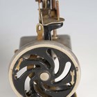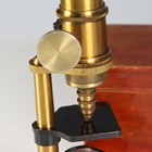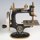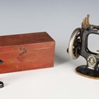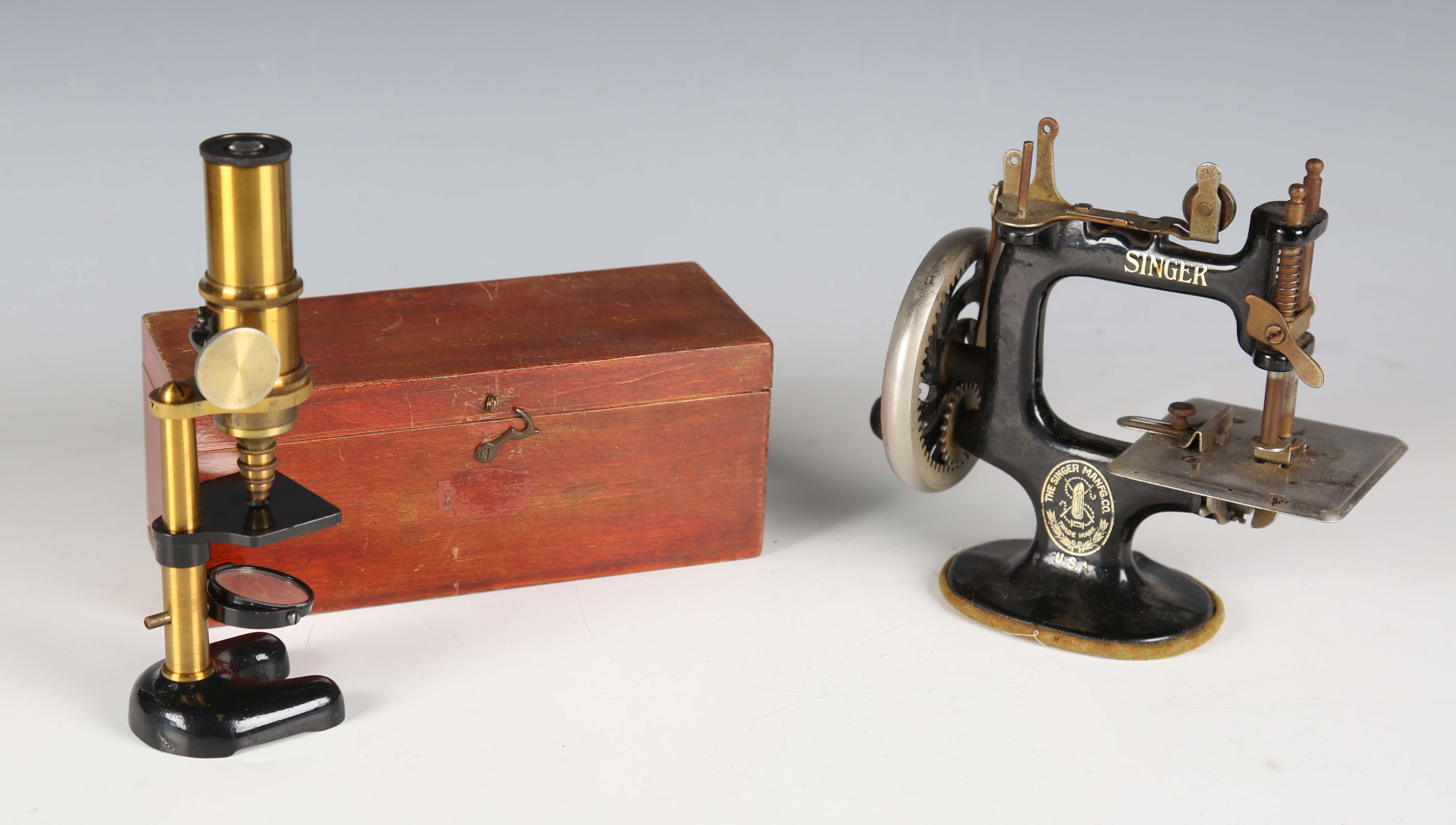A Singer child’s manual sewing machine, together with a single-pillar microscope and slides, within a wooden case.