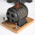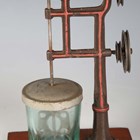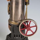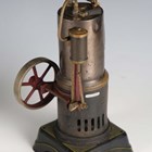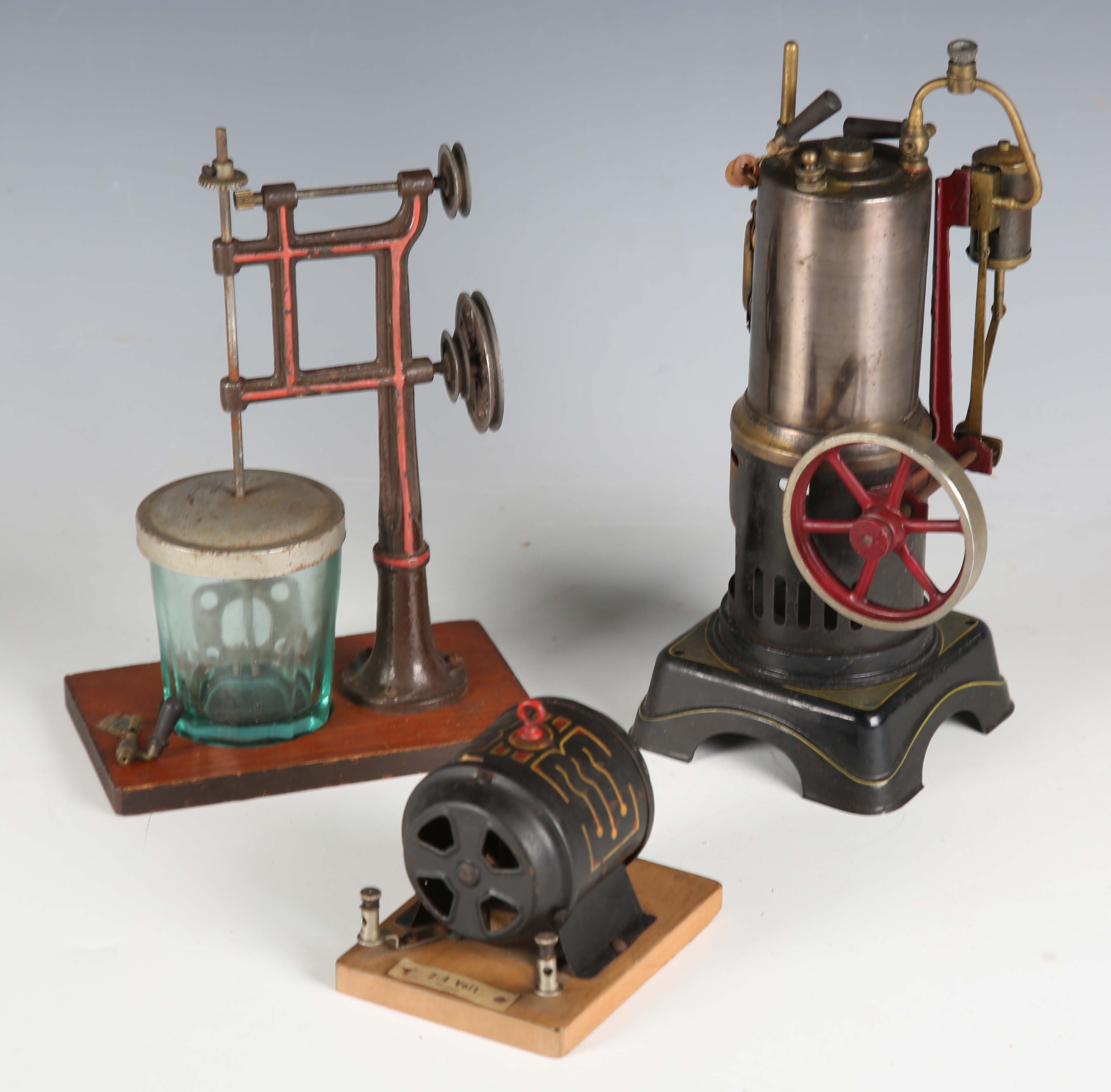 A Bing spirit-fired vertical live steam engine with 7cm flywheel, on a plinth base, height 25cm (lacking burner), together with a Bing flywheel driver mixer, on a wooden plinth base, and a German 2-4 volt generator, on a wooden plinth base.