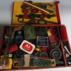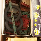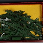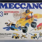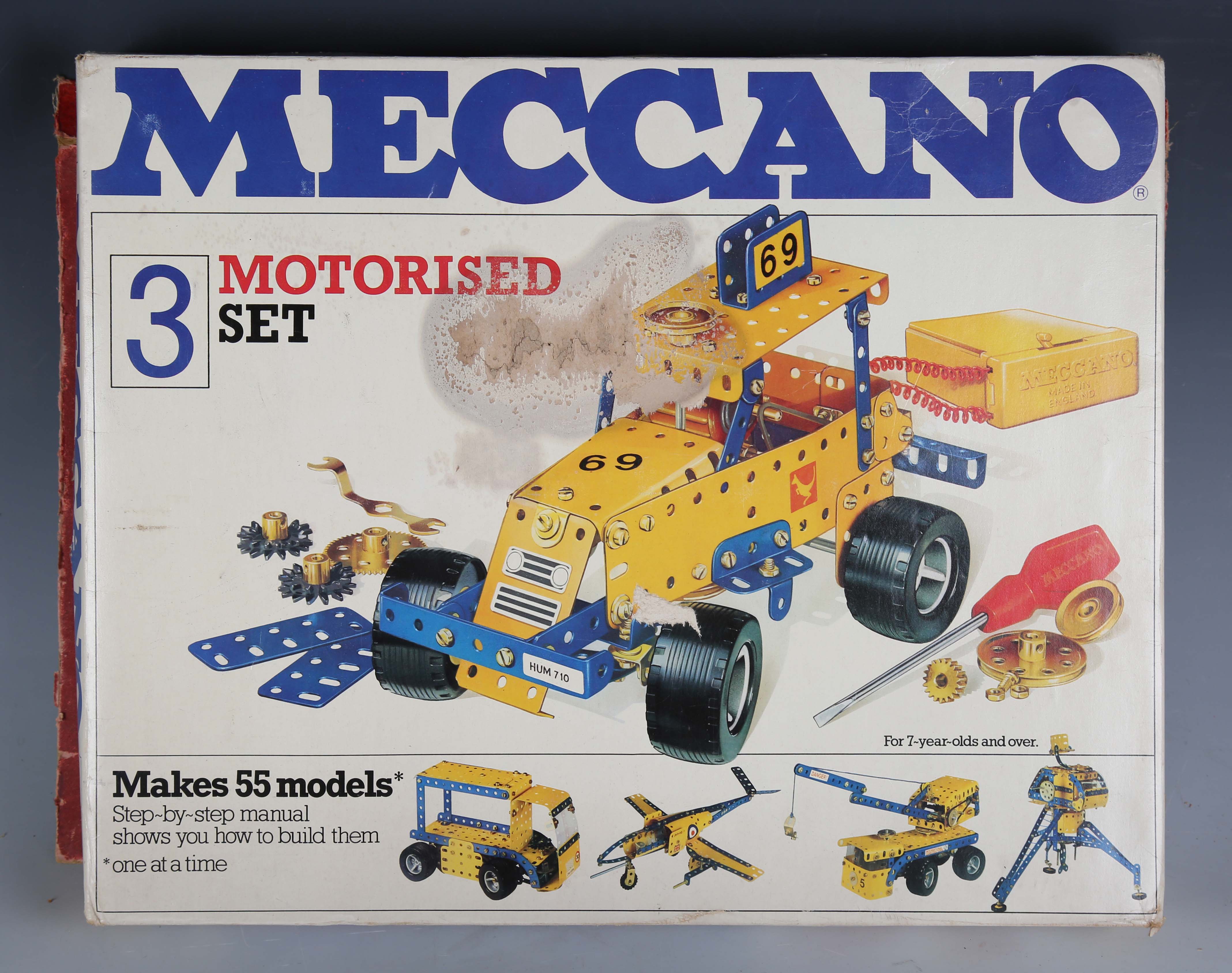 A collection of Meccano red, green and other parts, contained within No. 7 and No. 7A boxes, and a Meccano No. 3 motorised construction set, boxed (unchecked, playwear, boxes damaged).