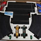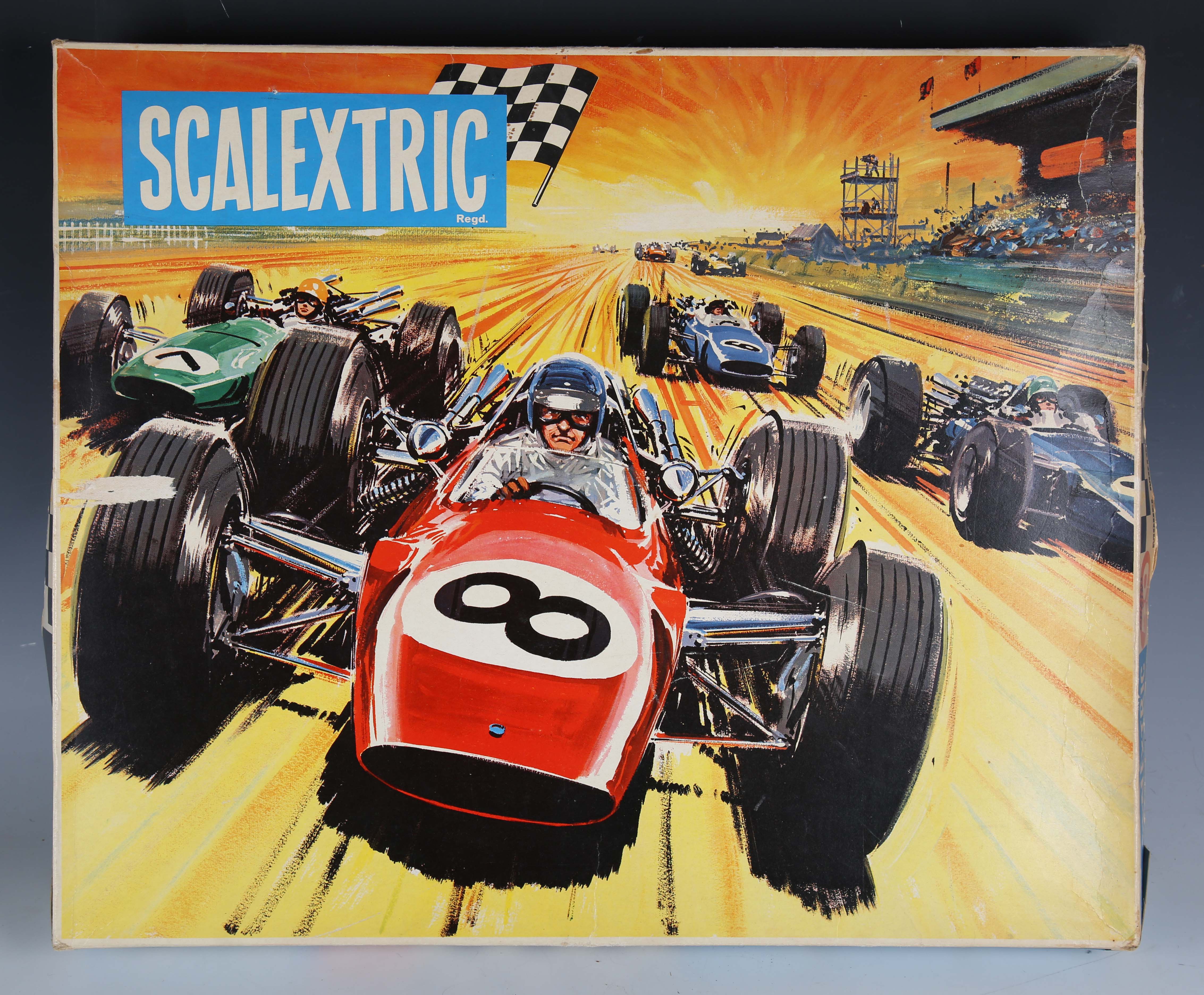 A Scalextric Grand Prix Set 50, including two open-wheel racing cars, track, controllers and accessories, boxed, together with a start gantry, track, plastic figures and trophies.